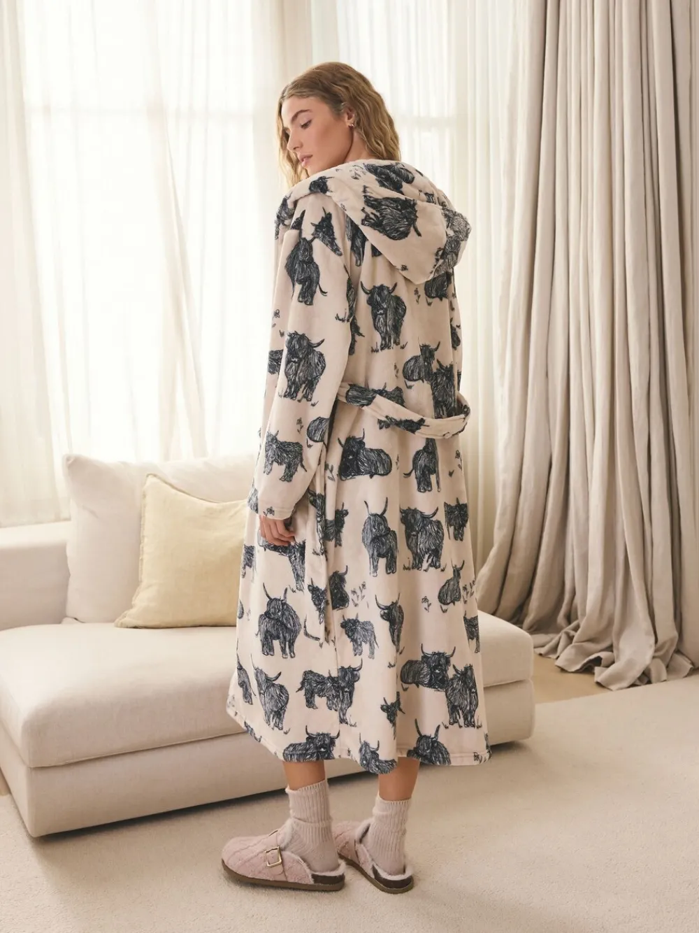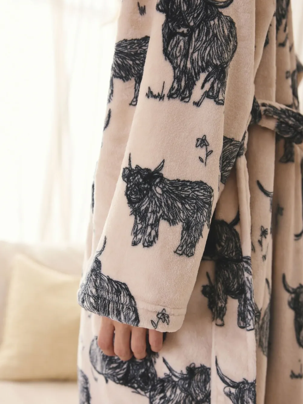 Wikkel uzelf in ultieme warmte met deze comfortabele, superzachte kamerjas. De zachte Crème fleece is versierd met een charmante all-over print van Hamish the Highland Cow, compleet met capuchon en Stropdas in de taille. Perfect voor luxueuze ontspanning bij Wonen. Superzachte fleecestof All-over Hamish Print Met capuchon Machinewasbaar. 100% gerecycled polyester. Waarschuwing: weg houden bij vuur en vlammen.