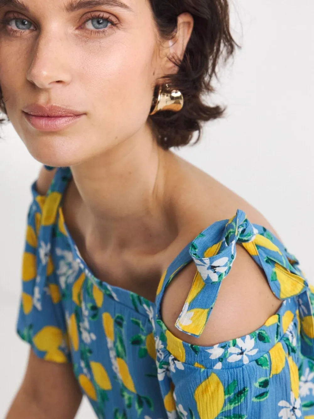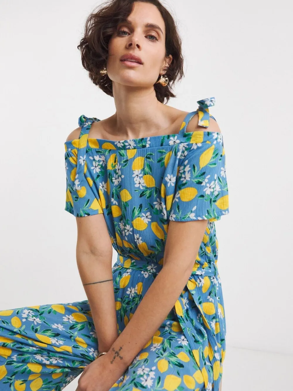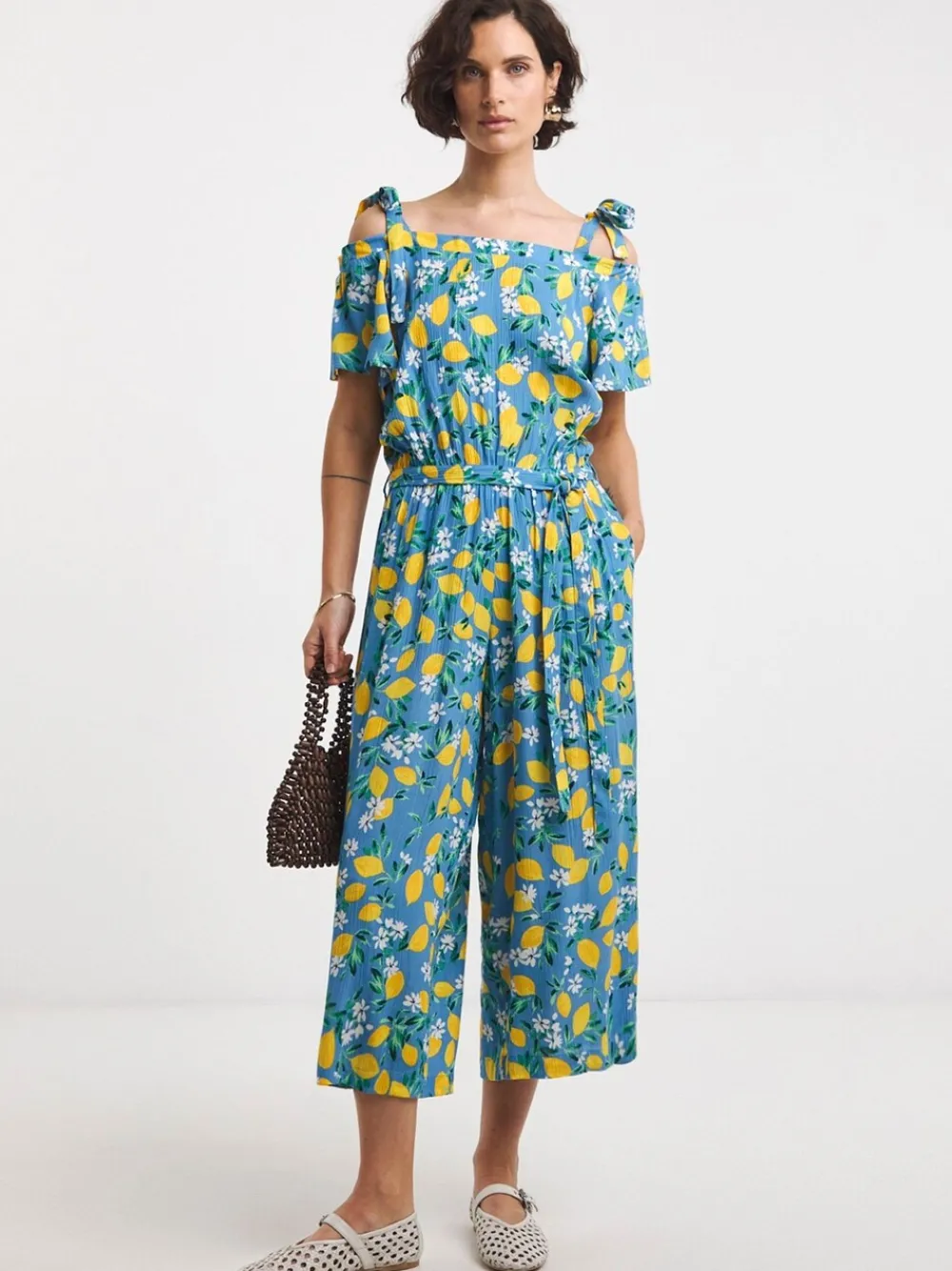 This new bardot shaped jumpsuit has been designed in a beautful print, making it easy to pair with anything! This jumpsuit features a bardot neckline bringing femininity to the heart of our design, short sleeves and a tie waist belt to cinch in at the waist . Machinewasbaar. 100% viscose.