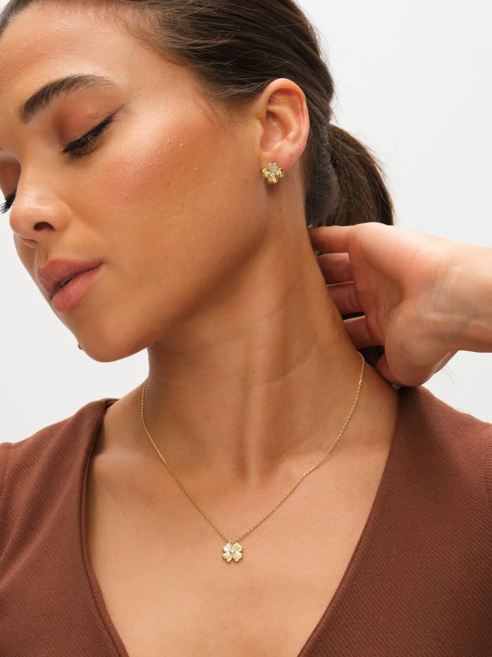 Our Inicio 14K Gold Plated and Cubic Zirconia Clover Set is a must-have, gorgeous trend-driven set designed to make a statement. Presented in a velvet Inicio gift box Perfect for gifting Fastening: Lobster Clasp, Post and Bullet Back Width dimension: 10mm Length dimension: 10mm Chain Length: 17” Material: 14K Gold Plated Base Metal 70% Koper, 30% zirkonia.
