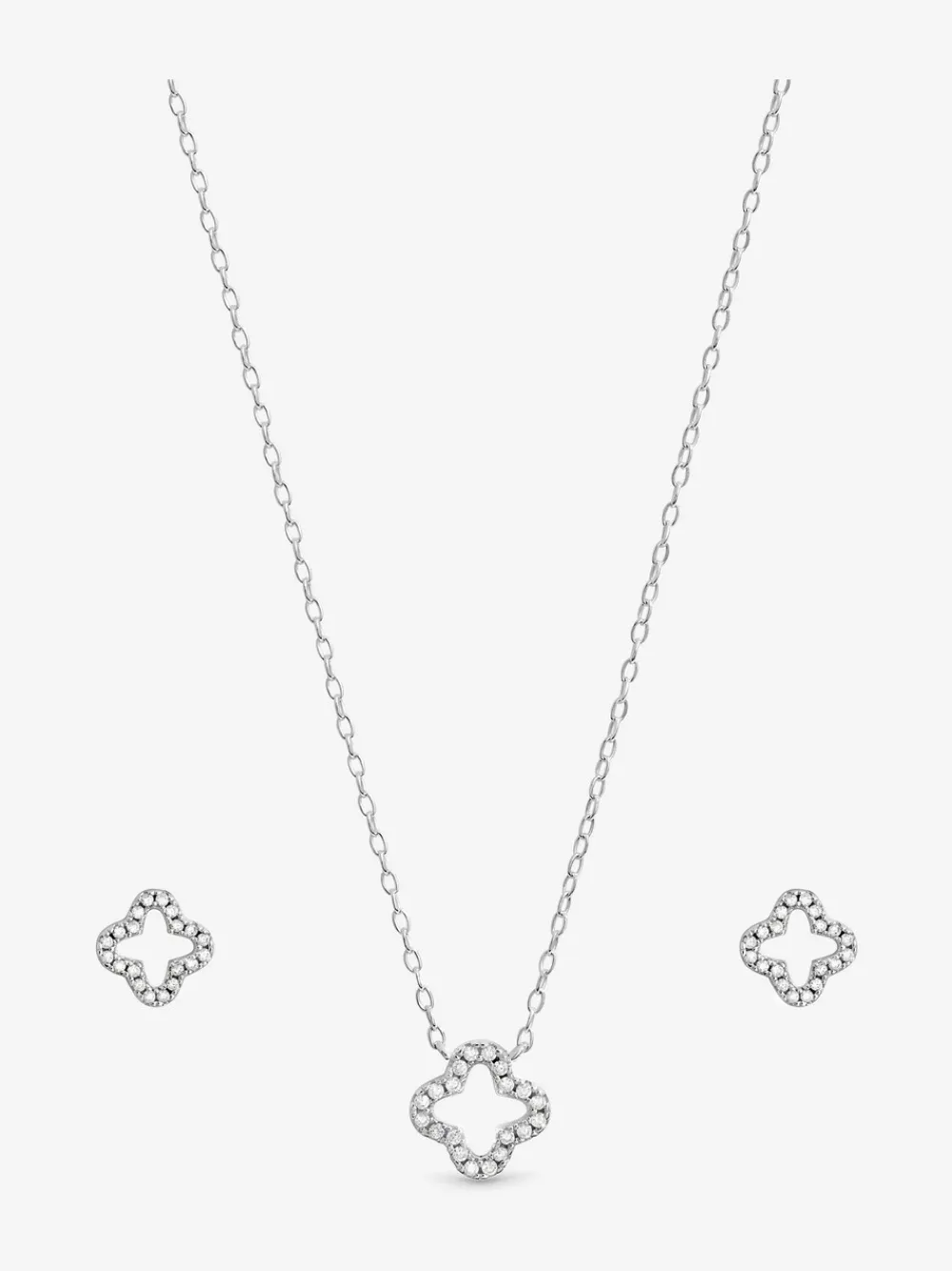 Our Cubic Zirconia Pave Open Clover Set features a matching pendant and stud earrings, each crafted in polished Sterling Silver 925 with an open clover design delicately encrusted with radiant pavé-set cubic zirconia. This set blends modern elegance with a classic symbol of beauty and balance. Packaged in a beautiful Snapshut gift box, this set offers a beautifully wrapped surprise for yourself or a loved one. Fastening: Lobster Clasp, Post and Bullet Back. Width dimension: 8mm. Length dimension: 406mm. Material: Sterling Silver 925. 80% zilver (sterling), 20% kubusvormige zirkonia.
