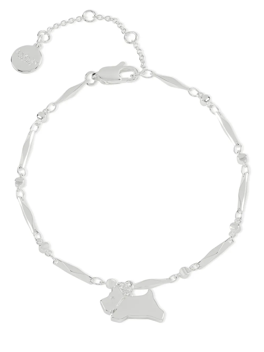 Radley Dames verzilverde springende hond bedelarmband. Deze gepolijste, Zilveren armband met rechthoekige schakels heeft een hangende bedel in de vorm van een springende hond met geëtste details. Inclusief Radley-geschenkverpakking.