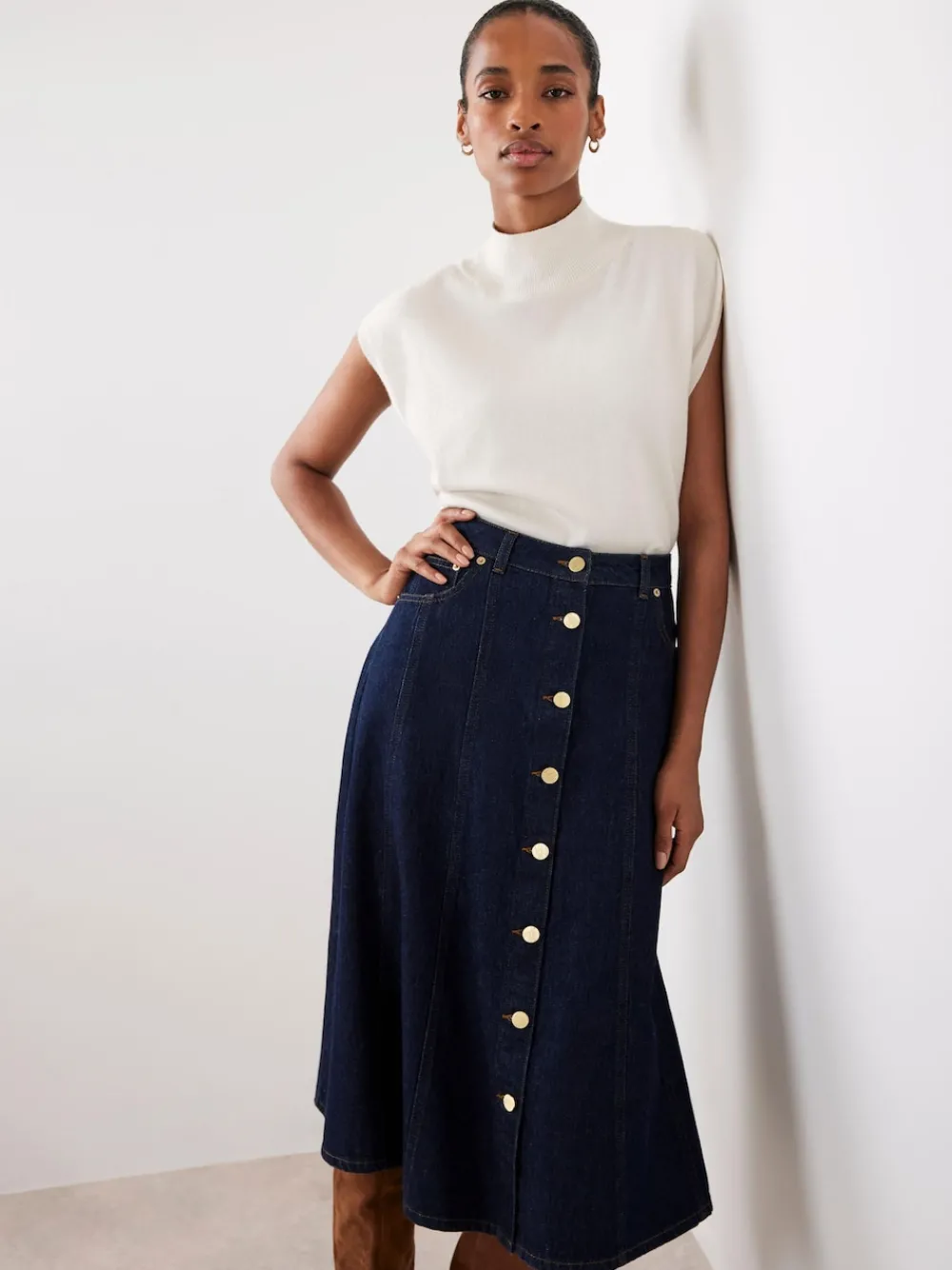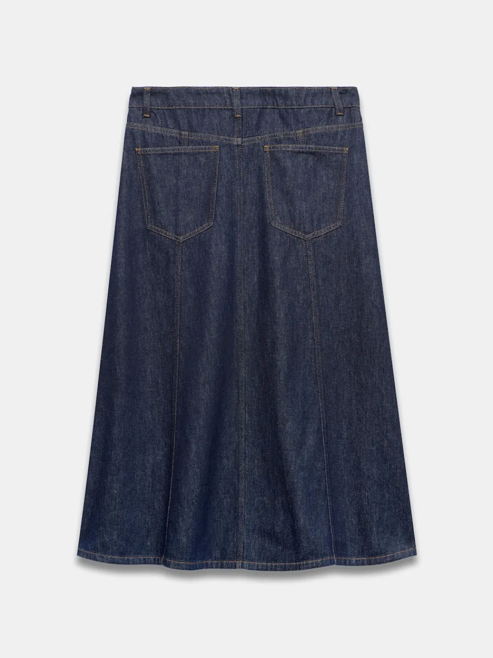 Dark indigo denim skirt in an A-line midi silhouette featuring a drop waistband, belt loops, five-pocket silhouette contrast stitching with a button fastening through the front. Machinewasbaar. 100% katoen.