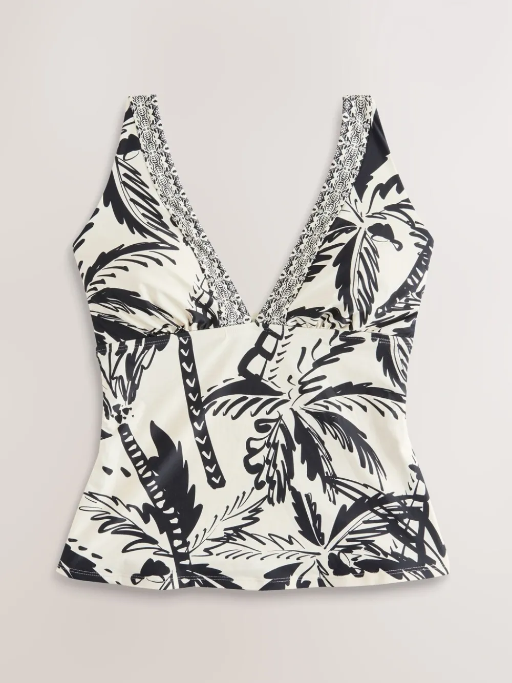This stylish tankini top features a flattering plunge neck and is designed with shaping mesh for tummy control. It provides SPF 50+ on covered areas and has wide supportive straps. The top is adorned with a striking Black/Cream Palm print. Plunge neck Shaping mesh for tummy control Provides SPF 50+ on covered areas Wide supportive straps Black/Cream Palm print Hoofdbestanddeel 85% nylon, 15% LYCRA® XTRA LIFE™ elastaan. Voering 92% gerecycled polyester, 8% elastaan. Mesh 88% nylon, 12% elastaan. Artikelen met het curve-logo zijn verkrijgbaar in de maten 18 en groter. Onze tall collectie is ontworpen om te passen bij vrouwen van 5’10” en langer. Dit is verhoudingsgewijs vergroot door het lichaam, de benen en de mouwen om de perfecte pasvorm te bereiken. Verkrijgbaar in maat 8-20.