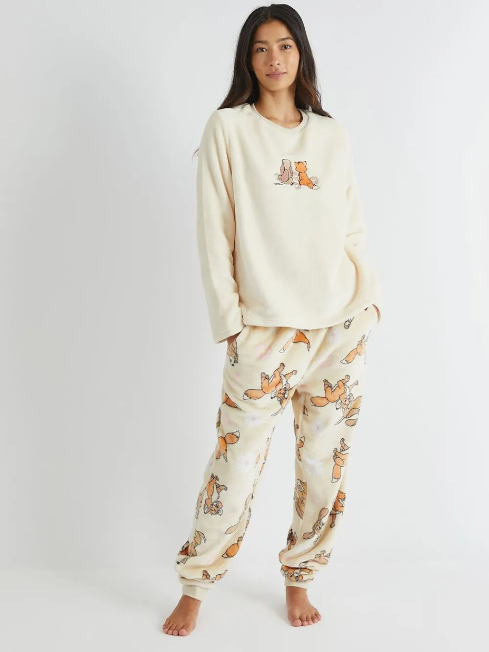 Snuggle up in ultimate comfort and nostalgia with the Skinnydip Disney Fox and The Hound Fleece Pyjamas Set. Inspired by the heartwarming Disney classic, this pyjama set features an adorable graphic of the unlikely duo, Tod and Copper, capturing the essence of their timeless friendship. Machinewasbaar. 100% polyester.