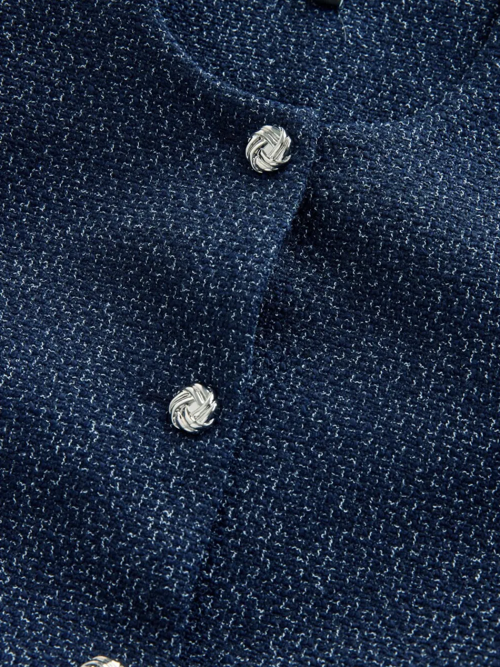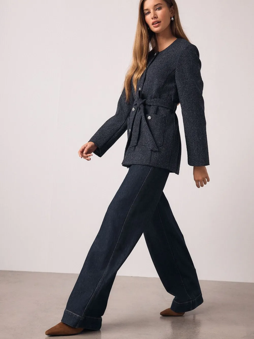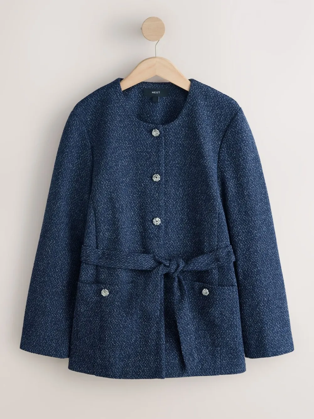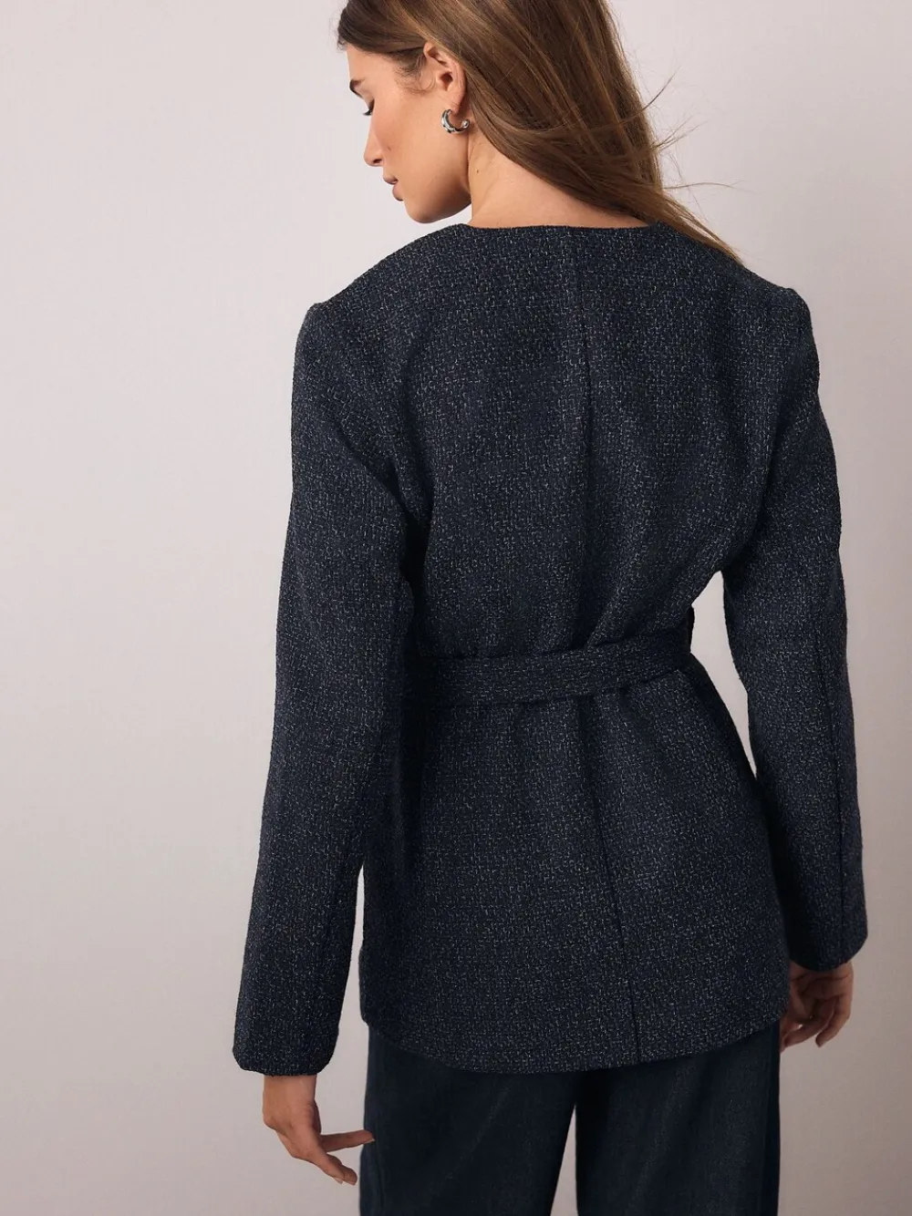 Sharpen your look with this Navy Fleck Bouclé Belted Jacket, an instantly sophisticated outer layer. The textured bouclé fabric is accented with striking buttons and a neat, collarless neckline. Featuring a flattering tie belt and practical front pockets, this jacket is perfect for elevated workwear or chic day-to-night styling. Bouclé fabric with navy flecks Tie belt at waist Collarless neckline Front pockets Standaard van het midden van de nek tot de zoom 28.5″ / 72 cm. Machinewasbaar. 100% gerecycled polyester. Artikelen met het curve-logo zijn verkrijgbaar in de maten 18 en groter. Onze tall collectie is ontworpen om te passen bij vrouwen van 5’10” en langer. Dit is verhoudingsgewijs vergroot door het lichaam, de benen en de mouwen om de perfecte pasvorm te bereiken. Verkrijgbaar in maat 8-20.