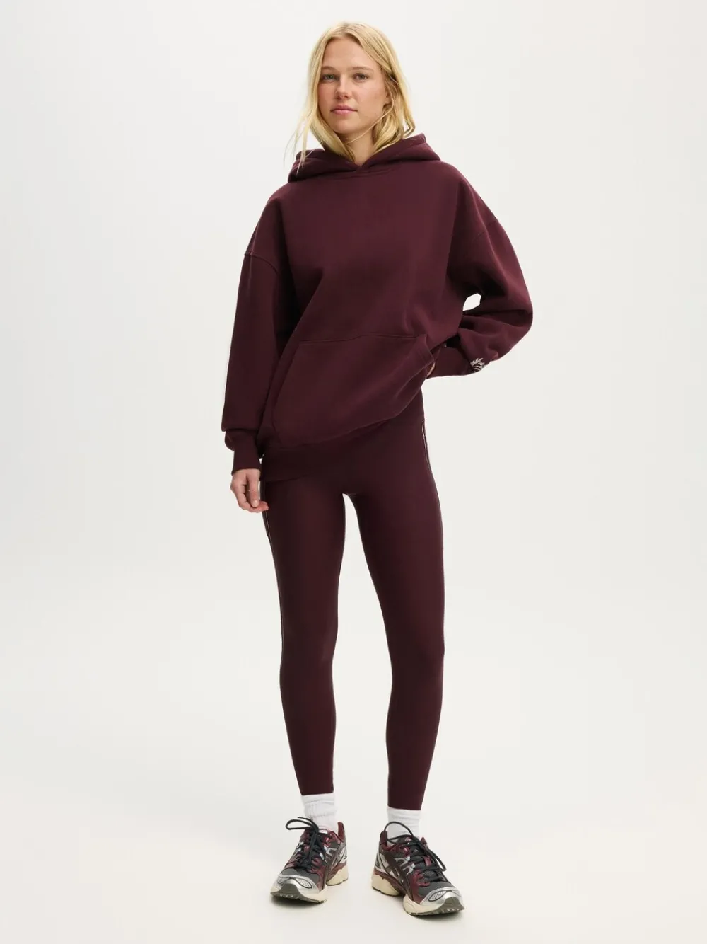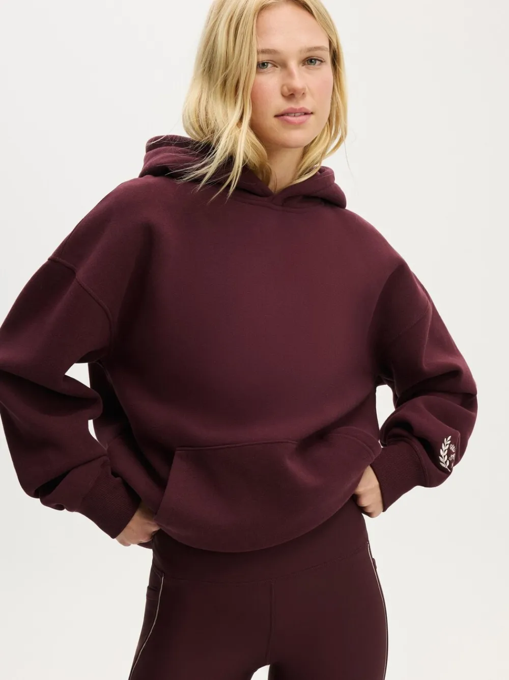 Oversized baggy fit for the ultimate comfy, cozy hoodie. Slouchy dropped shoulder. Full length sleeves with stretch ribbed cuffs. Classic, full coverage hood. Straight hemline. Front fleece lined kanga pocket to hold the essentials. Cozy plush fabric, brushed inner and peached outer for extra softness. Wellness warrior wardrobe staple. Machinewasbaar. 55% katoen, 45% polyester.