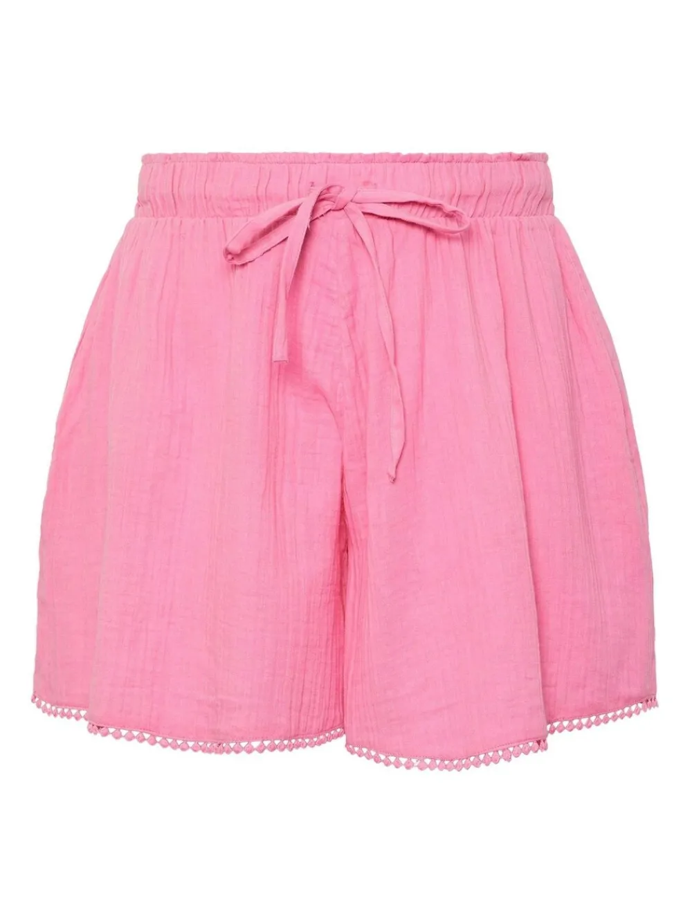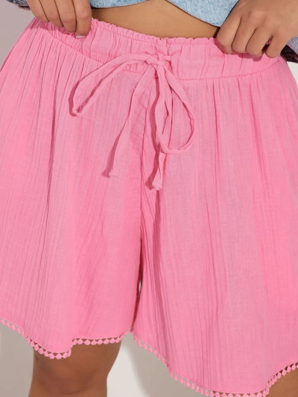 Fit Fashion Notes: These must-have shorts are perfect for the warmer weather ahead. Made from a woven crinkle fabric, they feature a crochet trim, a high elasticated waistband, two side pockets, and an elasticated waistband. Pair with a vest and sandals for perfect summer styling. Why We Love It: A holiday staple. Features: Crochet trim Elasticated waistband Adjustable tie waist drawstring Two side pockets High waisted Made from a woven crinkle fabric 100 cotton Machine washable Model is 5’9.5’/176.53 cm and size UK 16/EU 44. Machinewasbaar. 100% katoen.