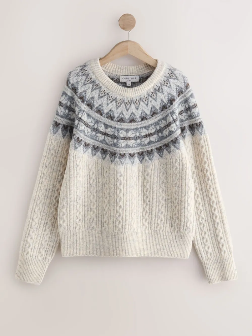 Elevate your winter collection with this sophisticated Ecru Cable Knit Sweater. Crafted with a luxury knit that includes Wool for superior warmth and comfort, this crew neck piece showcases an elegant combination of classic cable knit and a detailed Fair Isle yoke pattern in soft ecru, grey, and brown tones. This piece offers a refined approach to seasonal dressing, and coordinating family styles are available to complete a cohesive holiday look. Fair Isle and Cable Knit Construction Matching Family Jumpers Knitted fabric with added Wool Classic Crew Neck Silhouette Machine washable Machinewasbaar. 80% gerecycled polyester, 13% Acryl, 4% wol, 3% elastaan.