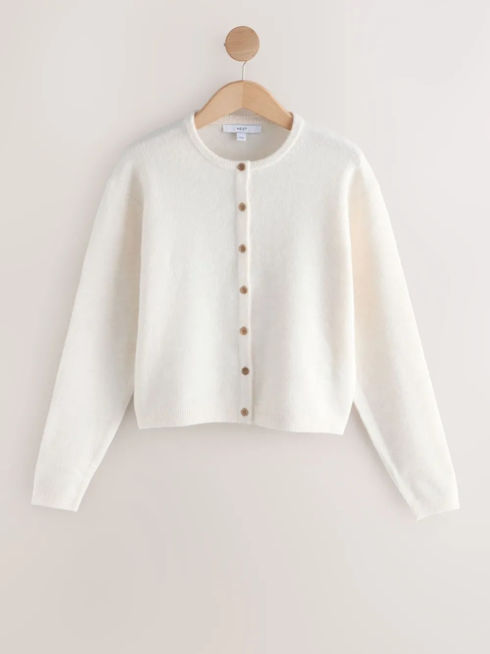 Layer up in timeless style with this ecru knitted cardigan. Its soft, plain fabric and classic crew neck make it an effortless essential. The button-through front is finished with charming wooden buttons for a subtle, natural detail. Wooden buttons Button through fastening Knitted Plain With wool Machinewasbaar. 52% gerecycled polyester, 37% Acryl, 8% wol, 3% elastaan. Onze tall collectie is ontworpen om te passen bij vrouwen van 5’10” en langer. Dit is verhoudingsgewijs vergroot door het lichaam, de benen en de mouwen om de perfecte pasvorm te bereiken. Verkrijgbaar in maat 8-20.