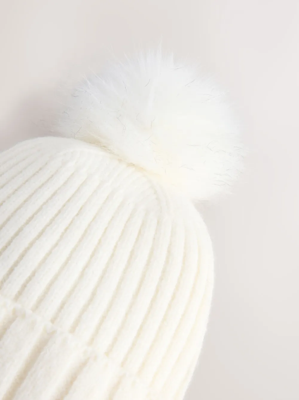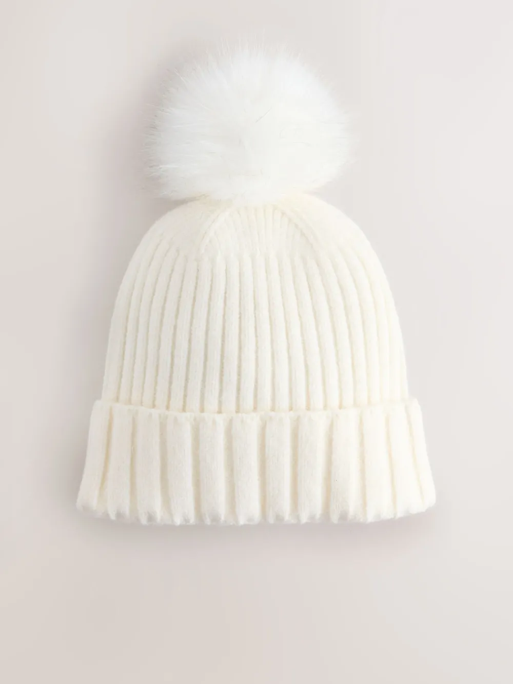 Stay snug and stylish in our rib knit pom pom hat. Rib knit Faux fur pom pom Cosy Hoofdmateriaal 45% acryl, 29% gerecycled polyester, 26% nylon. Bies 73% acryl, 15% polyester, 12% modacryl.
