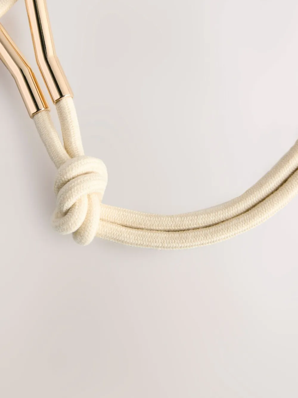 Deze riem geeft je look een Boho-gevoel met zijn Ecru afwerking en Goud hardware details. Ideaal om te dragen met jurken of maxi-rokken. Touwriem Gouden hardware Sluiting met gesp 100% polyester.