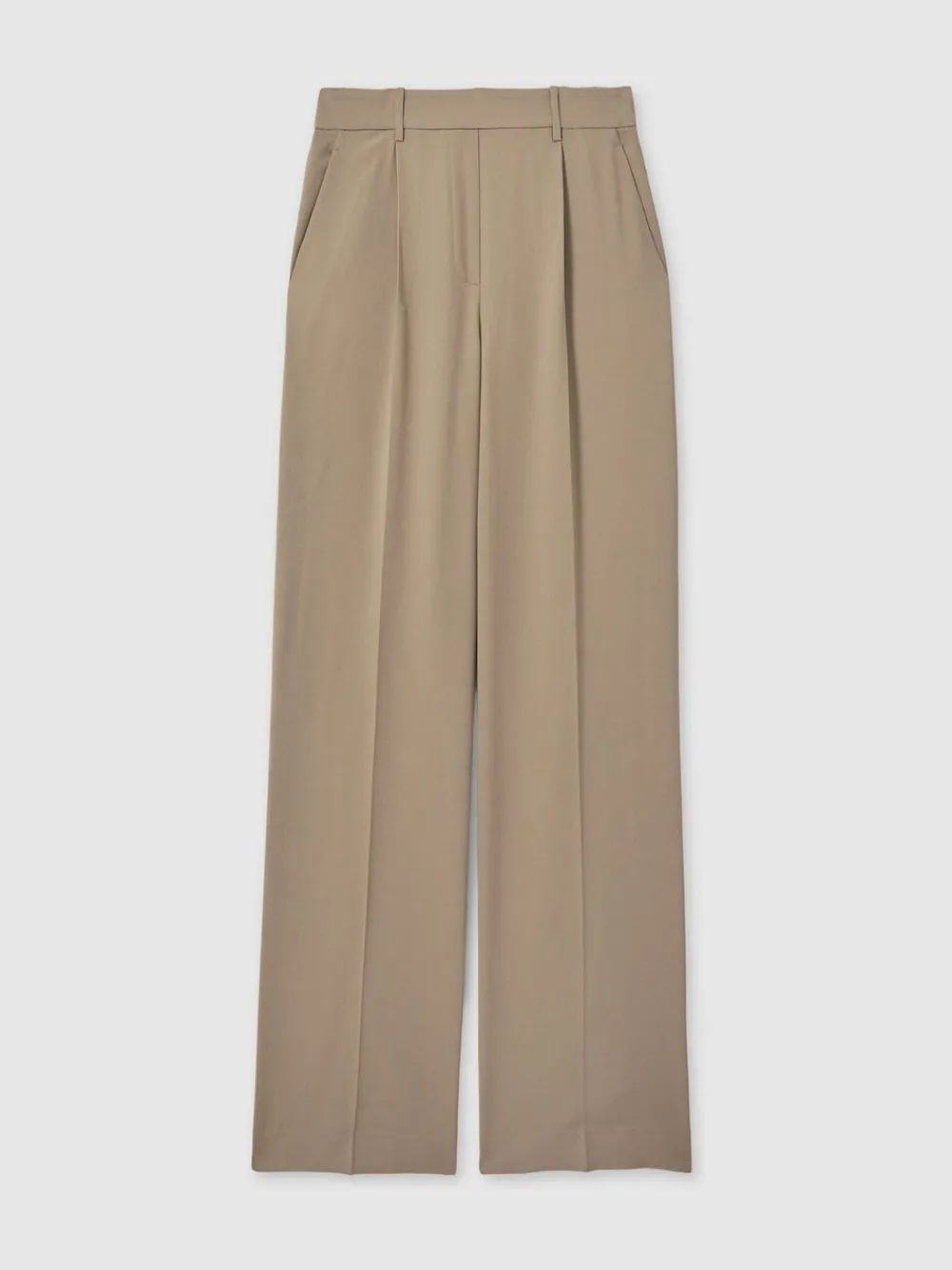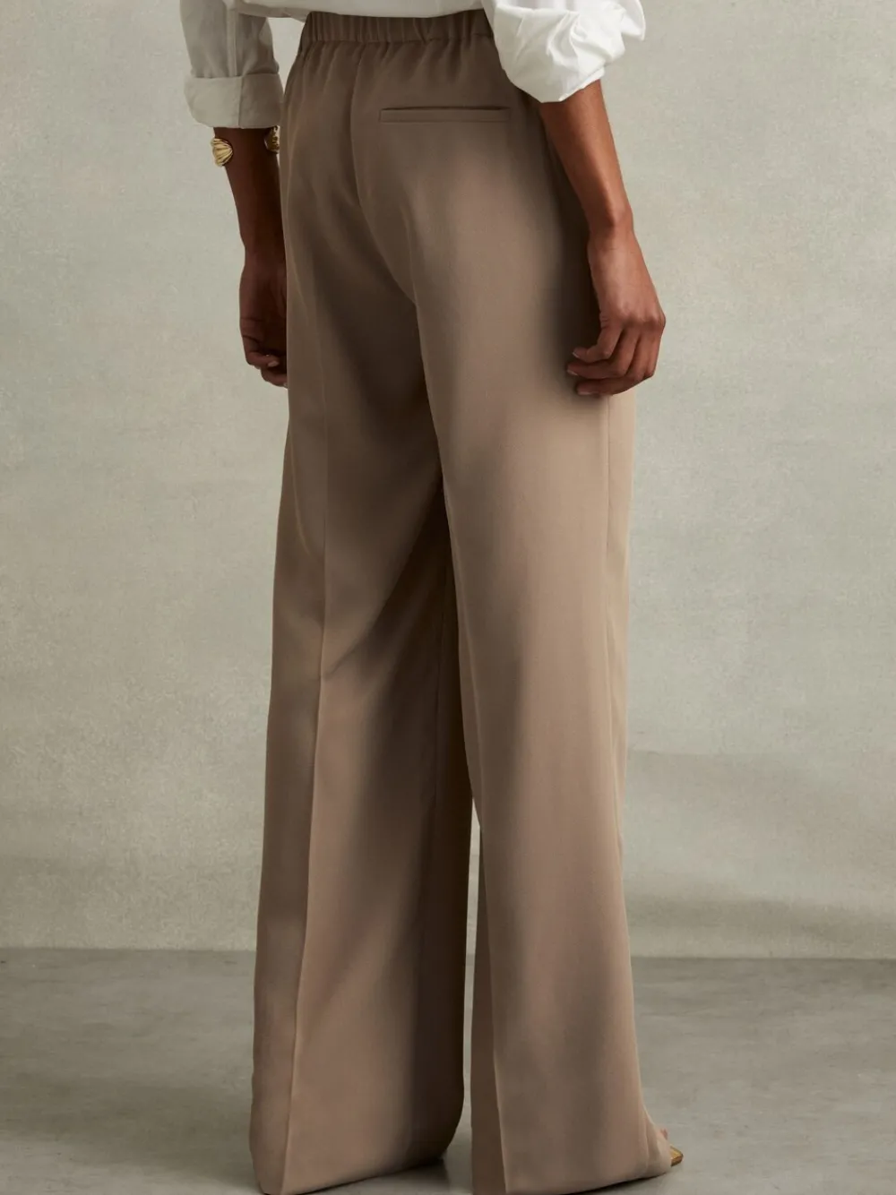 The lightweight twill of the mink neutral Eden trousers allows the wide-leg silhouette to drape effortlessly to the floor. An elasticated waistband adds a relaxed touch to the tailored pair. Lightweight twill Wide leg Elasticated back waistband Front pleats Side slip pockets Welt pocket to reverse The model is wearing a size 8. Measurements of model: Height 5ft 10” / 177.8cm. Standaard binnenbeenlengte 30,5″/78 cm. Machinewasbaar. 100% polyester.