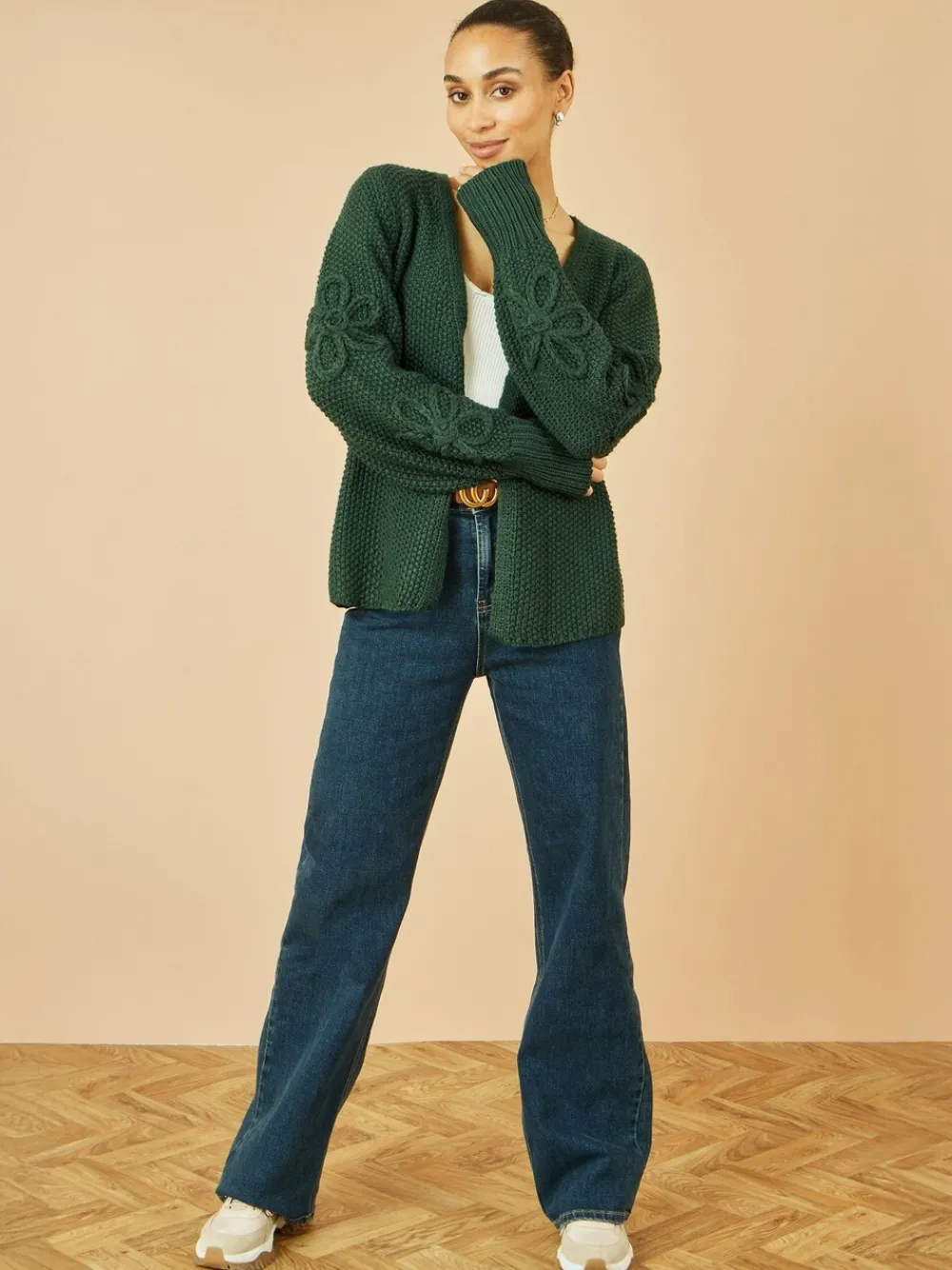 This edge-to-edge cardigan is detailed with flowers on the sleeves for a unique twist on your everyday warmer. This chunky knit looks perfect paired with denim and layered over any outfit to keep the chill off this season. Machinewasbaar. 100% Acryl.