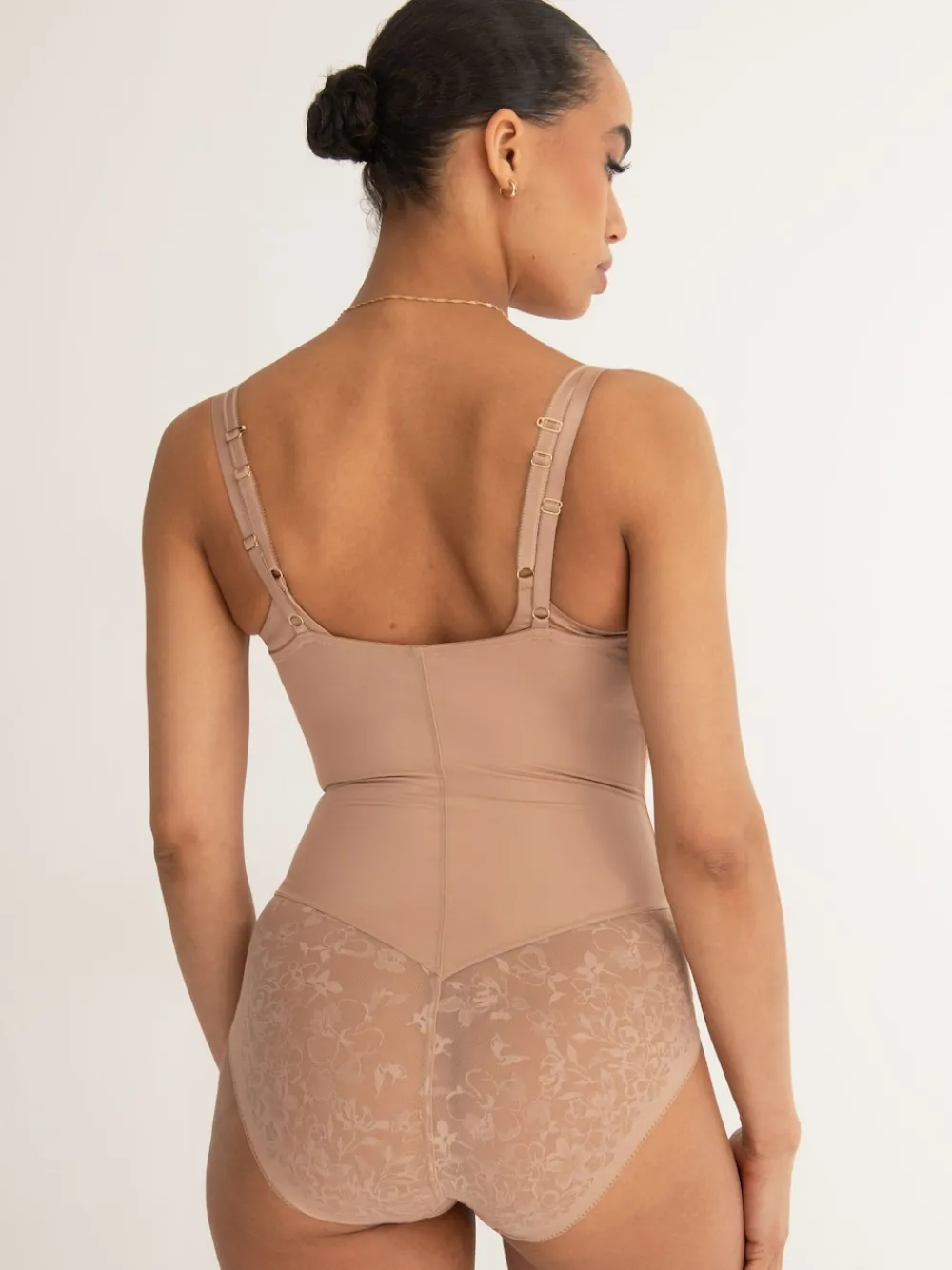 Ontdek ongeëvenaard comfort en zelfvertrouwen met de Effortless Shapewear Tummy Control Wear Your Own Bra Body – het toonbeeld van naadloze vormgeving die zich aanpast aan jouw mooie figuur. Ontworpen voor comfort en stijl, deze Shapewear body heeft ingebouwde buikcorrectie en is gemaakt van stretchy materiaal, waardoor u zich vrij kunt bewegen en toch effectieve controle en ondersteuning behoudt. Deze Shapewear body combineert stevige controle met uitzonderlijke stretch en herstel. De zachte, volledig verstelbare bandjes passen zich aan de bewegingen van uw lichaam aan en zorgen voor een comfortabele pasvorm, de hele dag door. Deze corrigerende body heeft een superhoge taille die onder je beha zit en is versierd met onzichtbare bloemenstof en bloemendetails op de beenlijn en de rug. Perfect geplaatst voor een gladde beenlijn zonder VPL. Draag de Effortless Shapewear Tummy Control Wear Your Own Bra Body met een beha uit de Effortless-collectie voor een Flatterend resultaat dat naadloos bij je outfit past. Alleen met de hand wassen. Buitenkant 61% nylon, 39% elastaan. Inzetstuk 100% katoen.