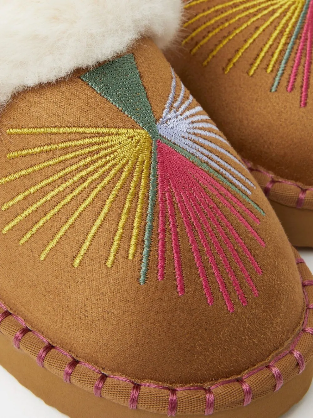 Why not slip into something a little more cosy?Made from tan suedette with a super-soft faux fur lining, these slippers are decorated with a burst of colourful embroidery on the closed toe design. Perfect for nights-in, lazy mornings and general mooching around the house. Bovenwerk – 100% polyester. Voering – 100% polyester.