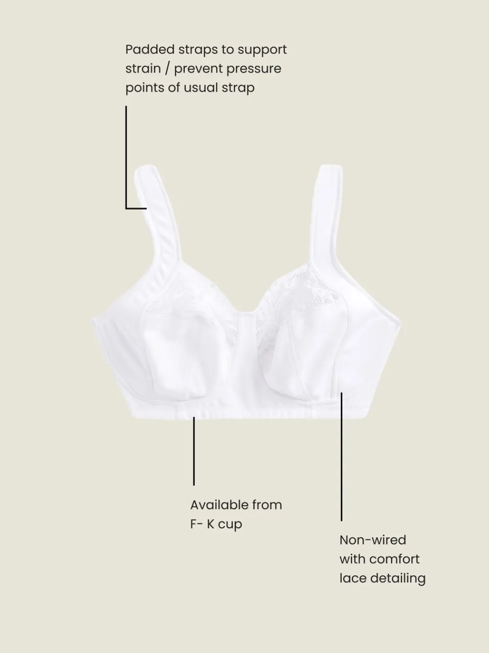Onze ultieme ondersteunende F-K cup witte bh is ontworpen voor vollere borsten en is een must-have voor in je Lingerielade. Deze beha zonder beugel en zonder vulling is voorzien van gevoerde en verstelbare bandjes en biedt de hele dag door een comfortabele en ondersteunende pasvorm. Deze bh is afgewerkt met decoratieve kanten details en biedt ondersteuning aan de zijkanten voor een geweldige lift en voorwaartse projectie. Hij is niet alleen ongelooflijk comfortabel, maar ziet er ook nog eens geweldig uit. F-K cup Gevoerde bandjes Zonder beugel Kantdetail Zijsteun Machinewasbaar. 90% polyester, 9% nylon, 1% elastaan. CoppaFeel! is de enige op jongeren gerichte borstkankerbewustzijnsorganisatie in het VK met als missie om elke jongere zijn of haar borst te laten controleren. Next is er trots op hun bra-hijackcampagne te steunen.