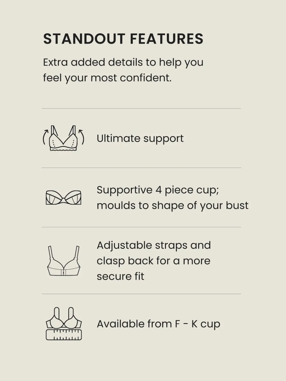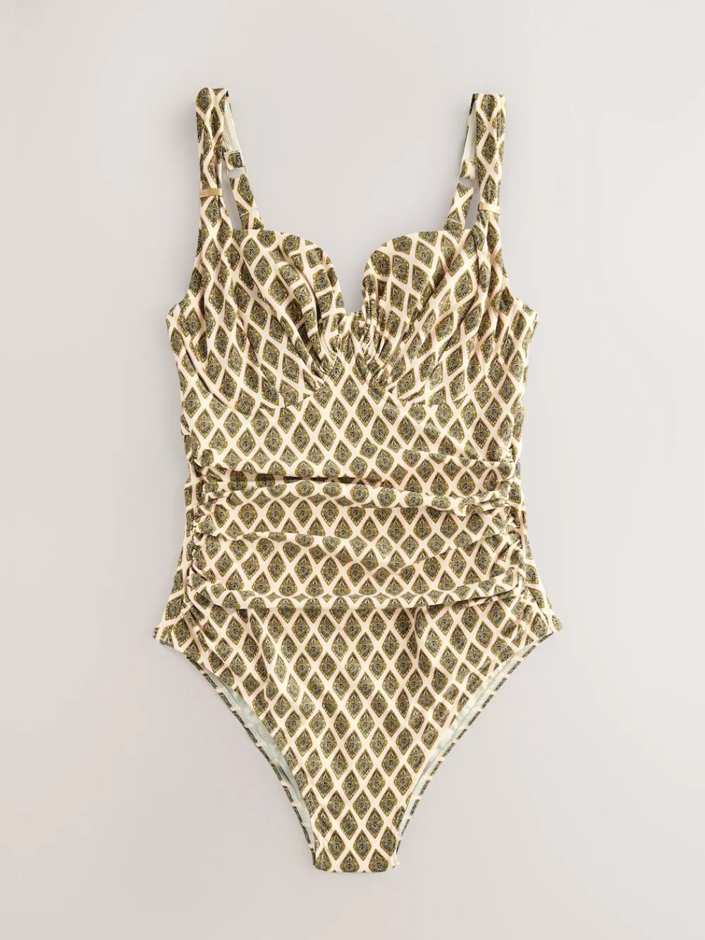 Dit comfortabele, ondersteunende en stijlvolle zwempak is speciaal ontworpen voor cupmaat F-K en is voorzien van beugels en een buikcorrigerend gaas voor een gevormd silhouet. Het zwempak heeft duurzame schouderbandjes en is gemaakt van SPF 50+ voor een goede bescherming tegen de zon op bedekte plekken. Ultieme ondersteuning Ondersteunende 4-delige cup Beugel Ontworpen voor maten F-K SPF 50+ stof Hoofdmateriaal 85% nylon, 15% LYCRA® XTRA LIFE™ elastaan. Mesh: 88% nylon, 12% elastaan. Voering 92% gerecycled polyester, 8% elastaan. LYCRA® XTRA LIFE™-vezel zorgt dat je ondergoed er langer als nieuw blijft uitzien met comfort- en pasvormbehoud. Dit innovatieve stretchmateriaal weegt weinig, ademt en behoudt zijn vorm bij telkens weer dragen en wassen. Deze stof voldoet aan BS EN 13758. – 1, zorgt voor bescherming tegen ultraviolette zonnestraling. Het is onafhankelijk getest en heeft een UPF-classificatie van 50+ gekregen, wat meer dan 97,5% van de UV-stralen blokkeert. Belangrijk advies: • Blootstelling aan de zon veroorzaakt huidbeschadiging • Alleen bedekte gebieden zijn beschermd • Gebruik altijd een zonnebrandcrème met een hoge beschermingsfactor voor gebieden van de huid die bloot worden gesteld aan de zon • De bescherming van deze stof kan worden verminderd bij gebruik of als het uitgerekt of nat is • Spoel altijd na elk gebruik af met zoet water • De stof biedt UVA- en UVB-bescherming tegen de zon.
