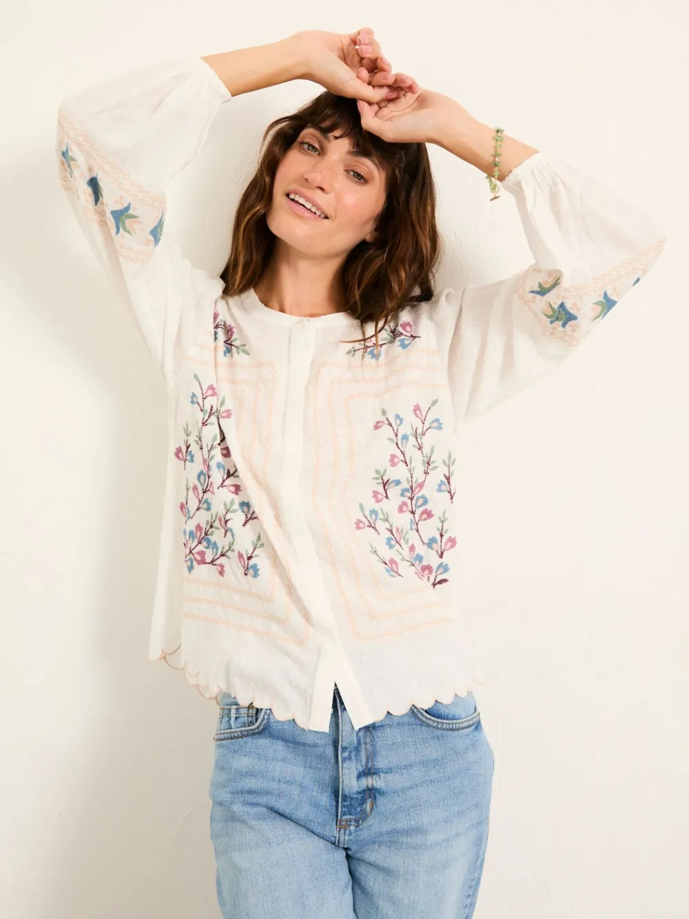 Our Betsie blouse features intricate floral embroidery across the front and sleeves. Crafted from soft and breathable fabric it has a relaxed silhouette, scalloped hem, and button-down front. A round neckline and cuffed sleeves complete the look with subtle polish. Perfect for weekday work fits to weekend plans. Machinewasbaar. Hoofdmateriaal 100% viscose. Borduursel 100% polyester.
