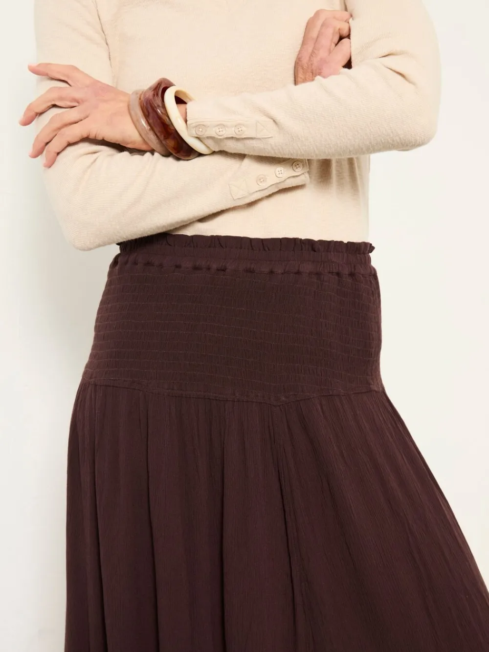 Our Harper maxi skirt features a shirred waistband that offers gentle stretch and a flattering fit, flowing into soft pleats that create effortless volume. Crafted from lightweight fabric, it drapes beautifully and feels comfortable all day long. Style with a fitted tee and sandals for warm-weather ease, or layer with a knit and boots as the seasons shift. Standaard van tailleband tot zoom 37,5″ / 95 cm. Machinewasbaar. 100% LENZING™ ECOVERO™-viscose.