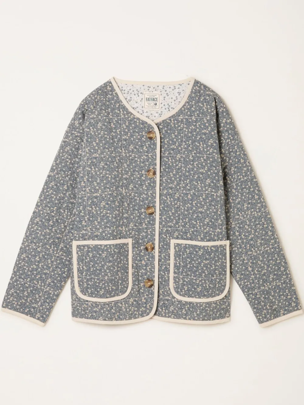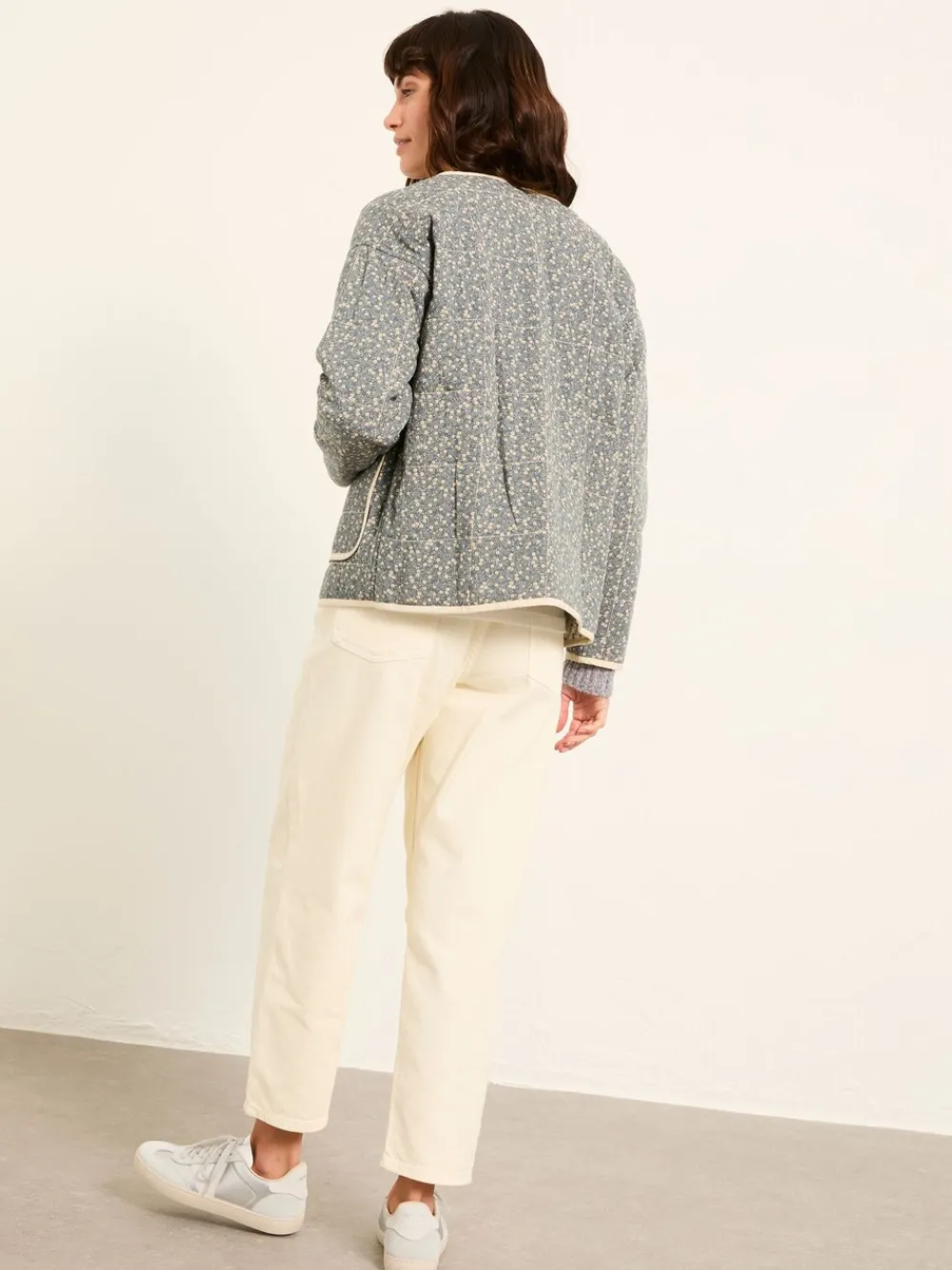 Our Milly ditsy quilted jacket is all about comfort with a touch of charm. Designed with curved hems, a button-down front, and two handy pockets, it’s finished with a relaxed fit that makes layering easy. The subtle ditsy print adds a playful twist, making it a perfect pick for breezy walks, weekend plans, or just throwing on when the day calls for something cosy and stylish. Standaardmaat van het midden van de nek tot de zoom 24″ / 61 cm. Machinewasbaar. Main 100% LENZING™ ECOVERO™ Viscose. Lining 100% Cotton. Filling 100% Recycled polyester. Embroidery 100% Recycled polyester.