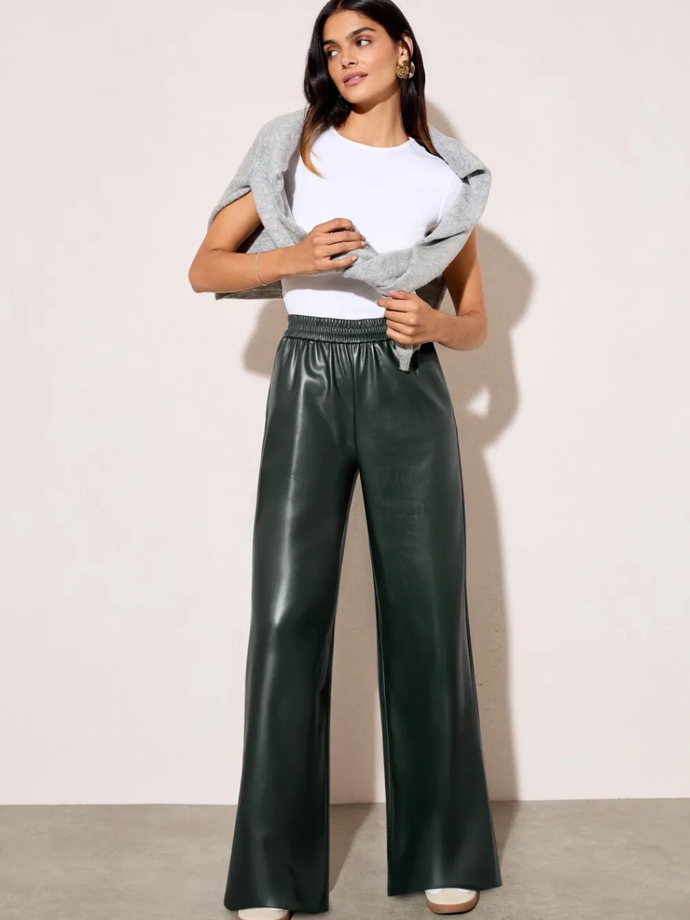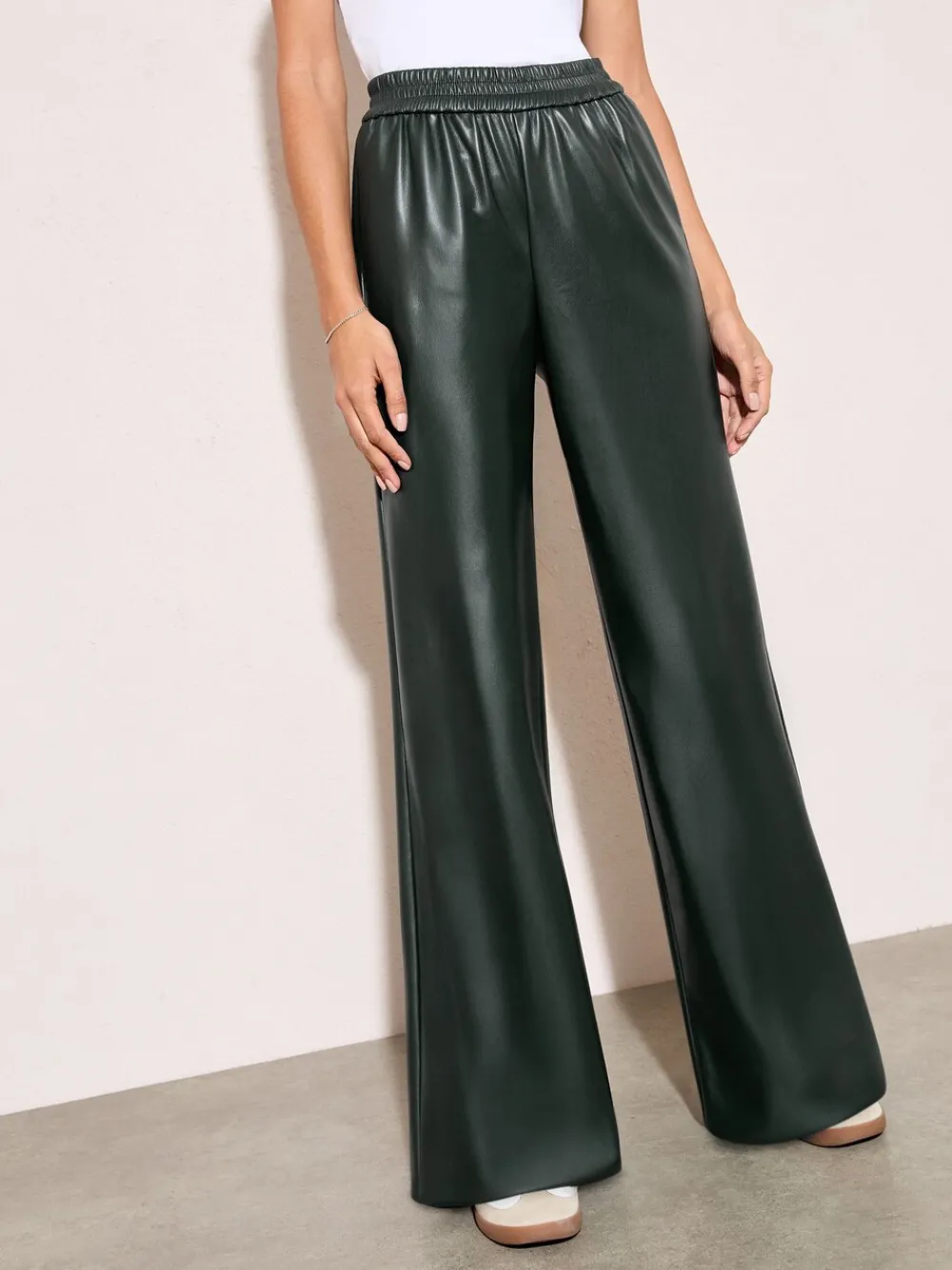 Achieve effortless style with these comfortable wide-leg trousers, featuring a sleek faux leather finish. The relaxed fit and practical elasticated waist ensure all-day comfort. Perfect for elevated daywear or dressing up for a chic, contemporary look. Faux leather fabric Wide-leg, relaxed fit Elasticated waist Wearing length: 80cm 100% polyester met PU-coating.