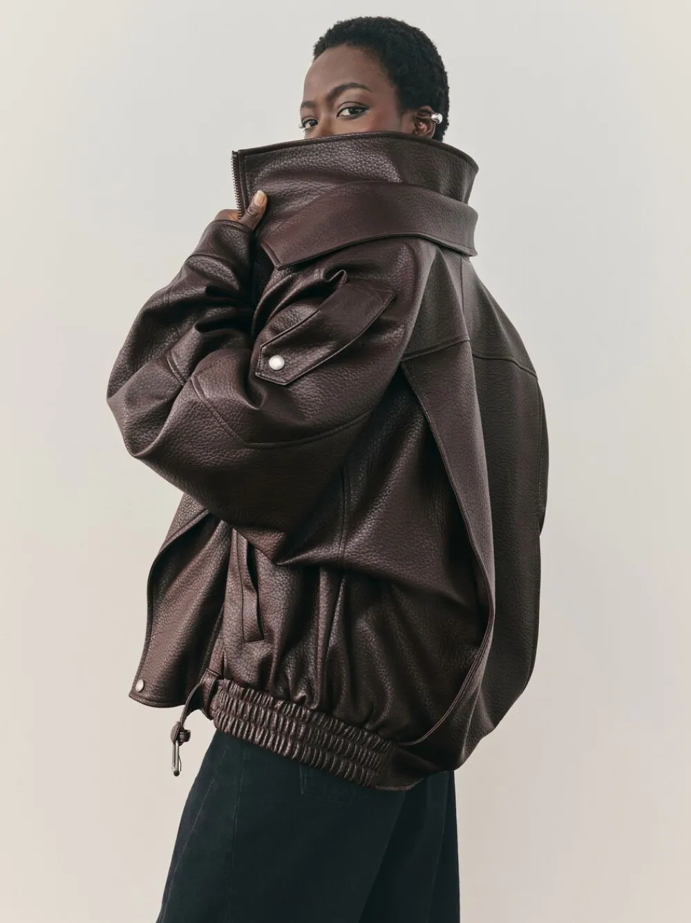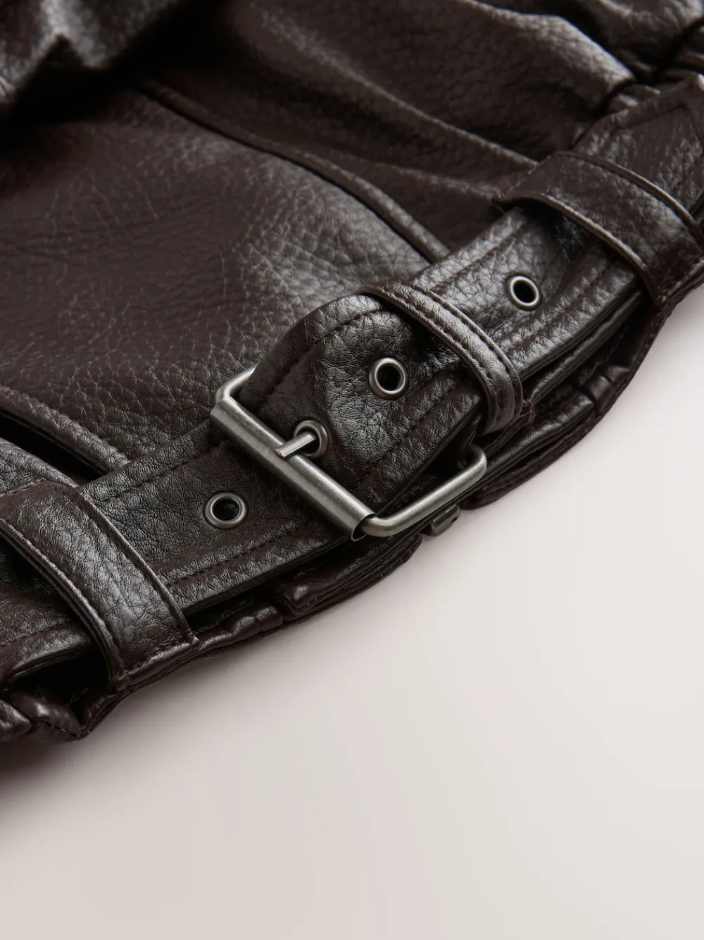 This Brown Faux Leather Funnel Collared Biker Jacket redefines the classic biker with avant-garde elegance. Crafted from luxurious faux leather, its relaxed fit and distinctive funnel neck and collared detail offer a sophisticated, modern silhouette. Featuring silver trims, a practical popper, and a buckle belt, it is a versatile wardrobe staple for seamless day-to-night confidence. Luxurious faux leather fabrication Relaxed fit with long sleeves Distinctive funnel collared neckline Silver buckle and trim details Versatile day-to-night staple Buitenkant 100% polyester met coating van PU. Voering 100% polyester.