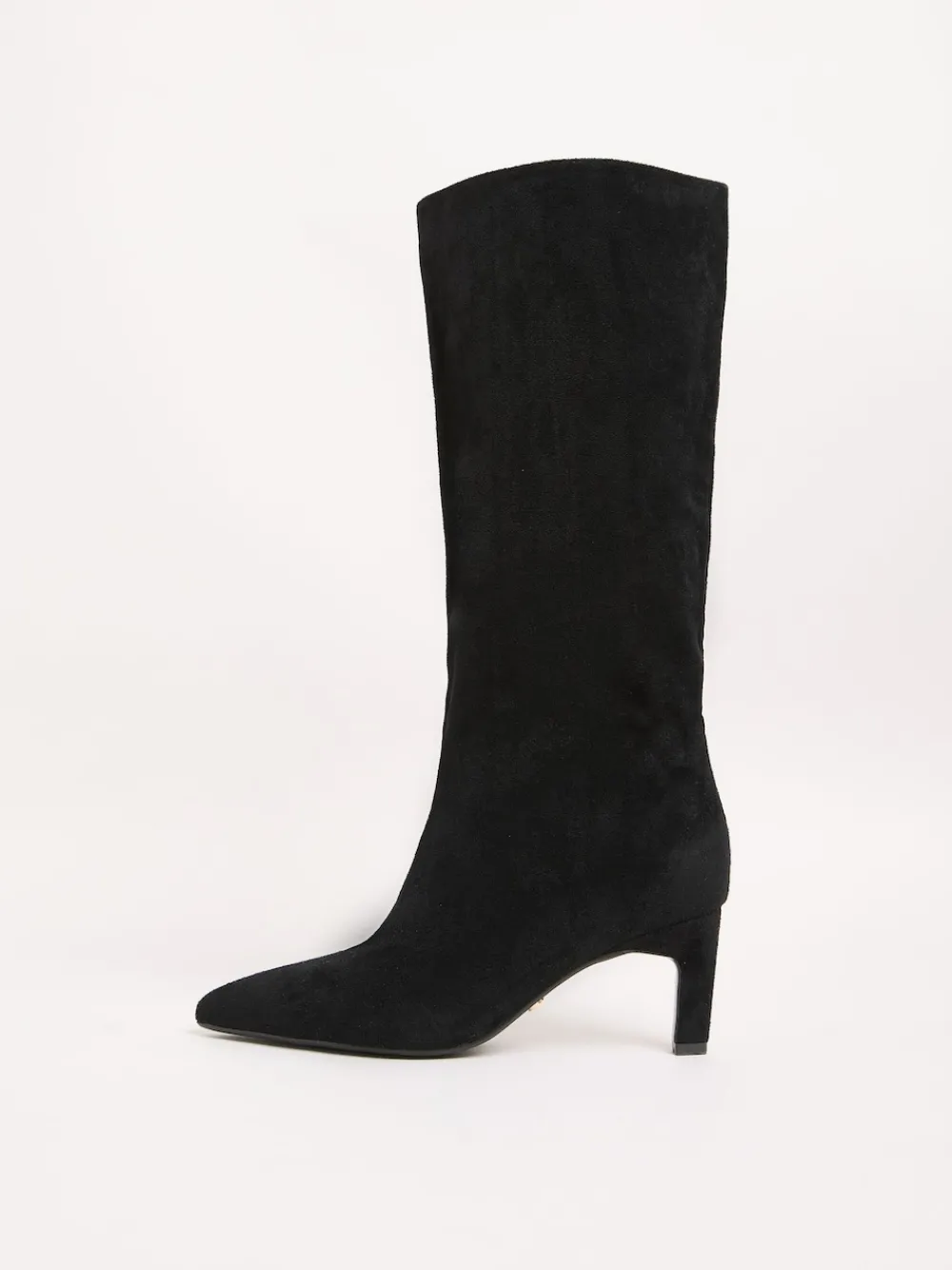 – Premium faux suede upper – Sleek shaft that goes to your knees- Refined pointed toe – Comfortable chic low, slender, kitten heel – giving you a the perfect lift for all day wear – Pull on style that is versatile for any oufit – Tuck in to trousers or pair with your favourite dress or skirt Hakhoogte 7 cm. Bovenwerk – textiel; voering en voetbed – textiel, overige materialen; zool – Andere materialen.