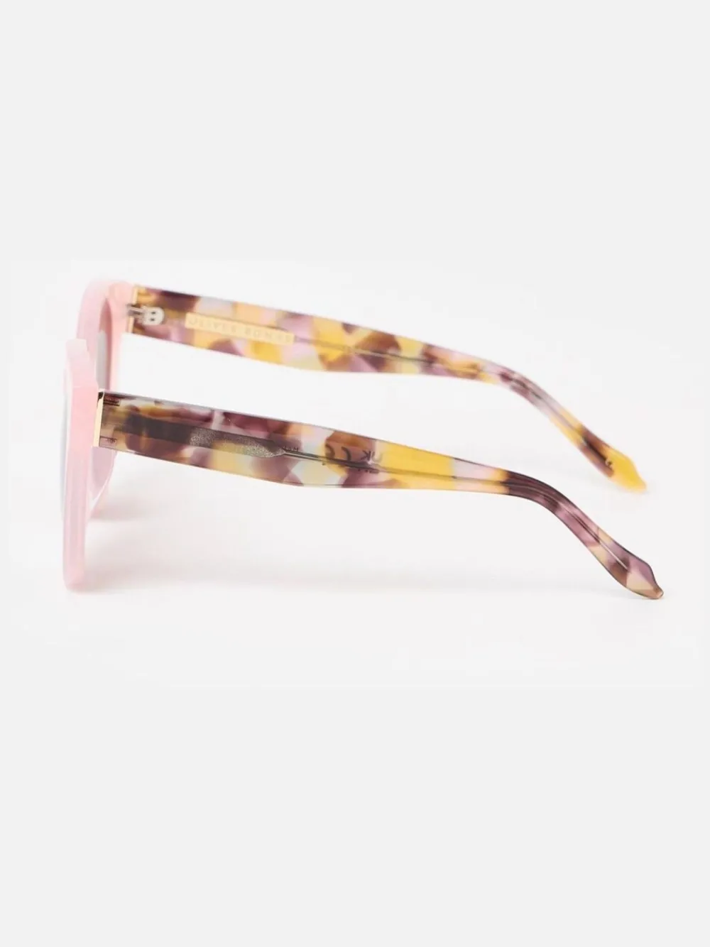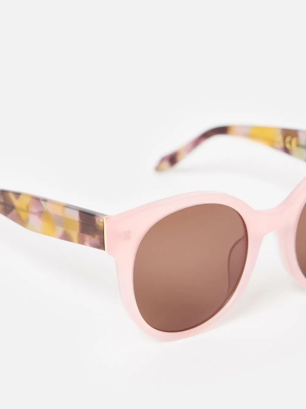 Round acetate sunglasses with brown tinted lenses, a light pink frame and faux tortoiseshell arms with a pop of yellow. 100% acetaat.