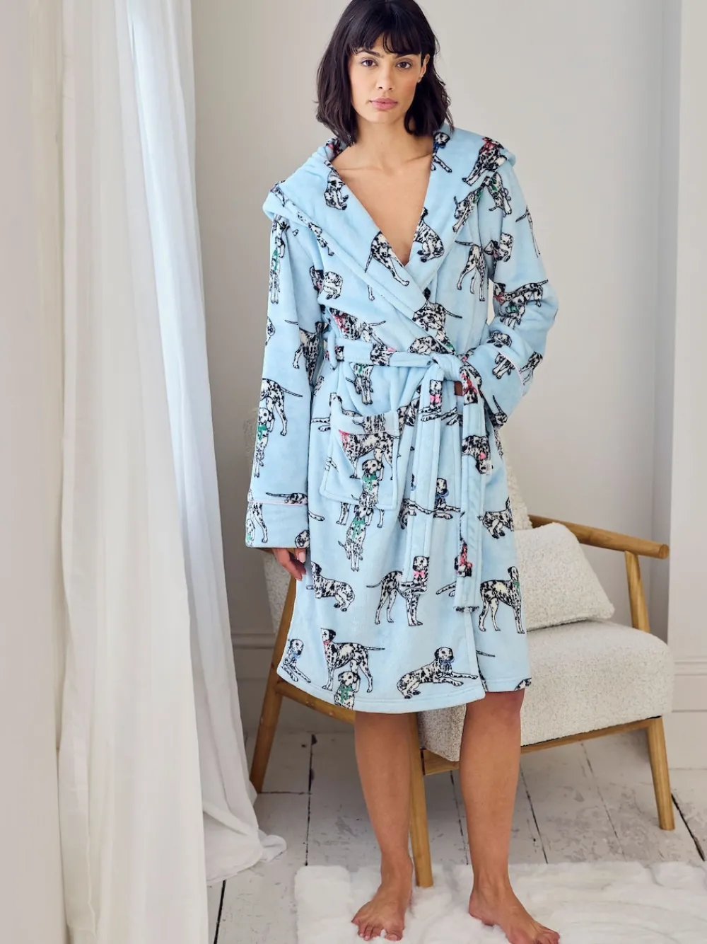 Spot something cosy? This plush fleece robe is all wrapped up in charm, thanks to a print of hand-drawn dalmatians wearing pastel ribbon bows. With a self-tie waist, generous hood and soft fleece, it’s the perfect throw-on for slow mornings, late-night lounging or walkies up to bed. Machinewasbaar. 100% gerecycled polyester.