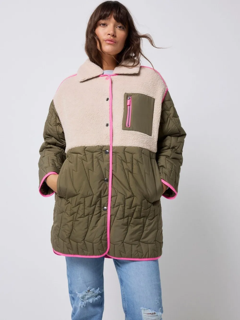 Keep the cold weather at bay. Cosy up in our quilted khaki lightning bolt coat, complete with soft borg panelling. This style boasts a detachable soft borg collar, popper fastenings and side pockets to provide versatile styling and practicality all year round. Shell and borg – Quilted lightning bolt detailing, Neon pink binding, Popper fastening, Detachable soft borg collar, Two side pockets, Contrast front pocket with branded rubberized zip fastening, Signature neon pink embroidered lightning bolt on the sleeve, True to size. Model in the image is Size 8 Height 5ft 8” Wearing a size 6/8 – XS. Machinewasbaar. 100% polyester.