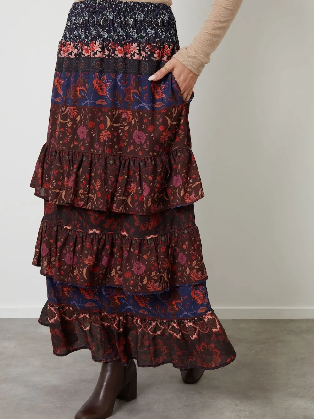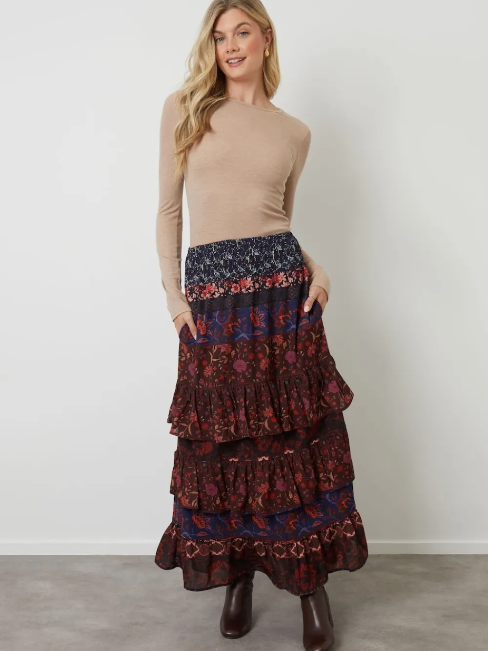 This elegant floral tiered maxi skirt is the perfect silhouette to flatter all body shapes. Our pull-on skirt is in a maxi length and has a shirred elasticated waist for comfortable all-day wear. Fabric gathers at the tiers to create volume, and it’s finished with two handy side pockets. Model wears UK size 8. Machinewasbaar. 100% polyester.