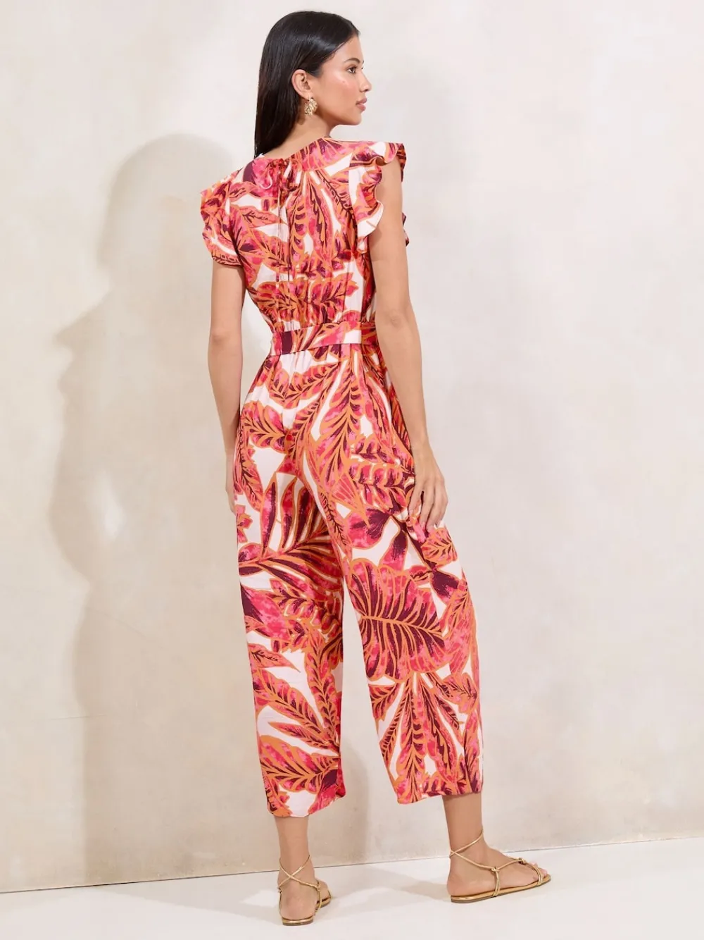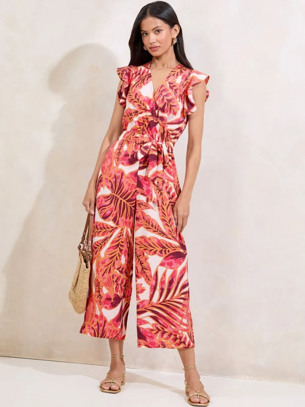 Embrace effortless elegance in the Lipsy Pink Palm Printed Ruffle Sleeve Jumpsuit. This chic jumpsuit showcases a beautiful pink palm print with stylish ruffle sleeves, offering a comfortable yet sophisticated silhouette. Perfect for sunny brunches styled with sandals or dressed up with wedges for a lively garden party. Also perfect for summer beach holidays. Sizing & Fit : Model is 5’9 and wears a size 8. 86% viscose, 14% nylon.