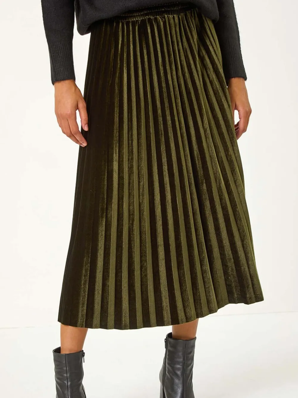 Make a statement in this luxurious velvet pleat skirt, a must have for the Autumn/Winter season. Crafted from sumptuous velvet fabric, this midi length skirt features an elasticated waistband for easy pull on styling. The pleated detail adds a touch of elegance to any outfit, perfect for both casual and dressy occasions. Pair with cosy knitwear and your favorite boots for a chic and stylish look that is sure to turn heads! Standaard van tailleband tot zoom 31″ / 79 cm. Machinewasbaar. 100% polyester.