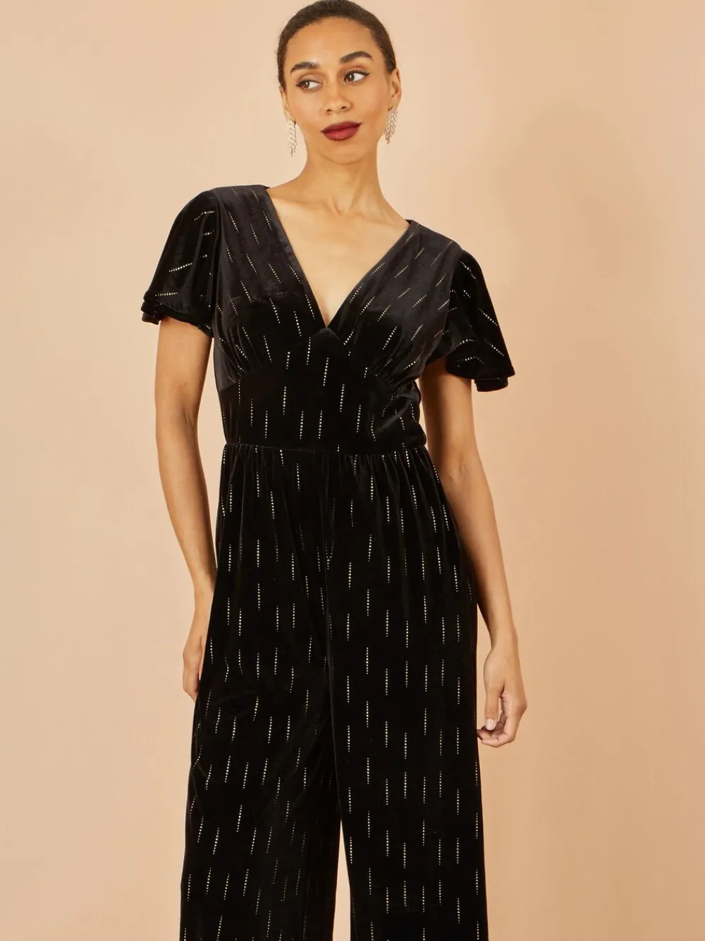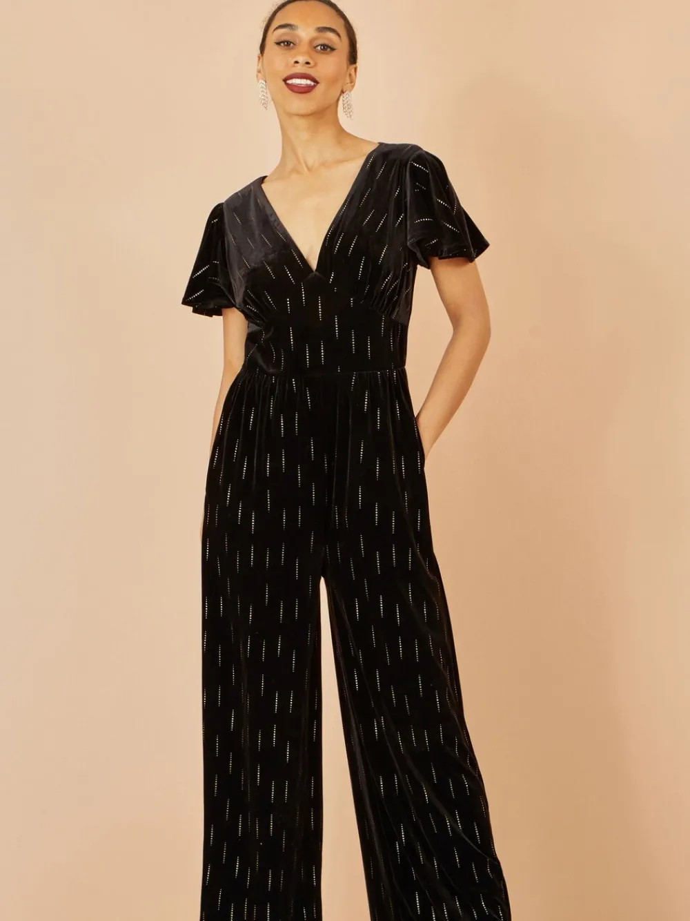 This all over foil print jumpsuit is perfect for any invite this winter. The V-Neckline is framed with angel sleeves and flattering waistline. This wide leg style is comfortable and feels incredible in luxe velvet. Machinewasbaar. 95% polyester, 5% elastaan.