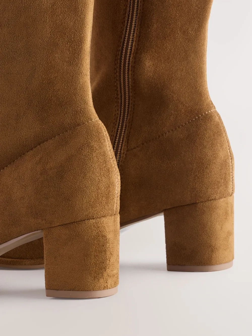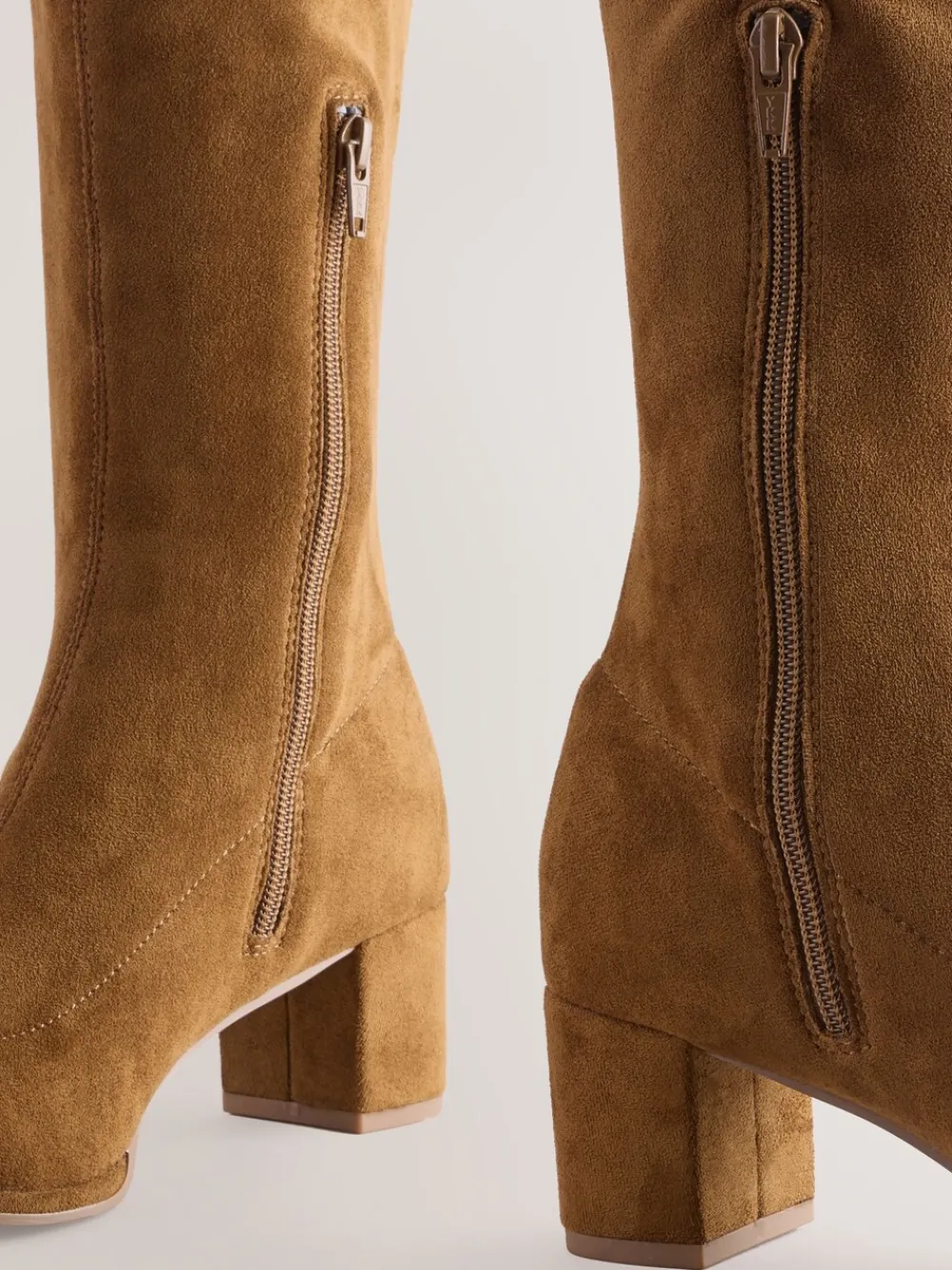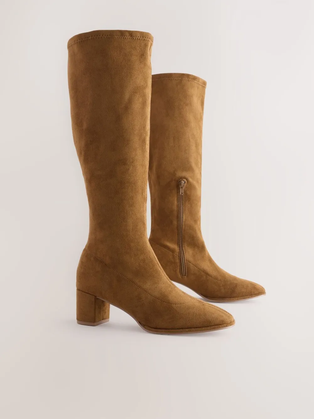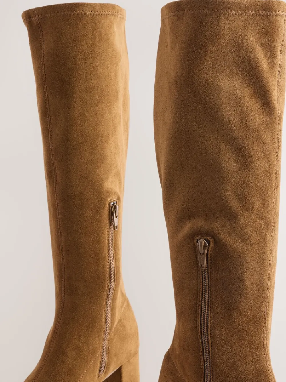Deze stijlvolle, kniehoge boots hebben een bovenkant van zacht suède met een ronde neus en een sokvorm voor een ingetogen look. Ze zijn afgewerkt met een ritssluiting aan de zijkant en een blokhakken. Kniehoog Kunstsuède Ronde neus Blokhak Zijritssluiting Hakhoogte 5,5 cm. Bovenwerk – textiel; voering en voetbed – Andere materialen, textiel, zool – Andere materialen.