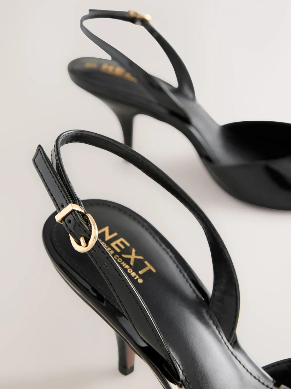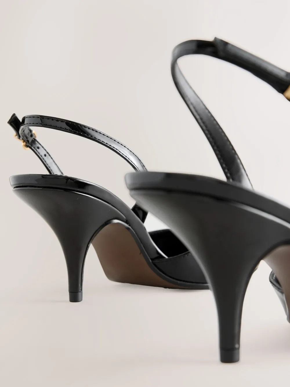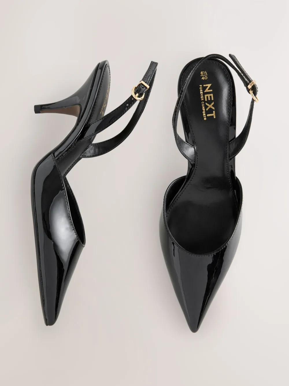 Exude sophistication with these sharp pointed toe slingback heels. Crafted with a sleek black patent upper, the elegant curvy design and slender kitten heel offer timeless glamour. Featuring Forever Comfort® padding and an adjustable strap, these are your essential desk-to-dinner shoes for chic confidence. Glossy patent upper Elegant pointed toe Secure adjustable slingback Forever Comfort® cushioning Curvy heel design Hakhoogte 8 cm. Bovenwerk – Andere materialen, voering en sok – overige materialen, zool – Andere materialen.