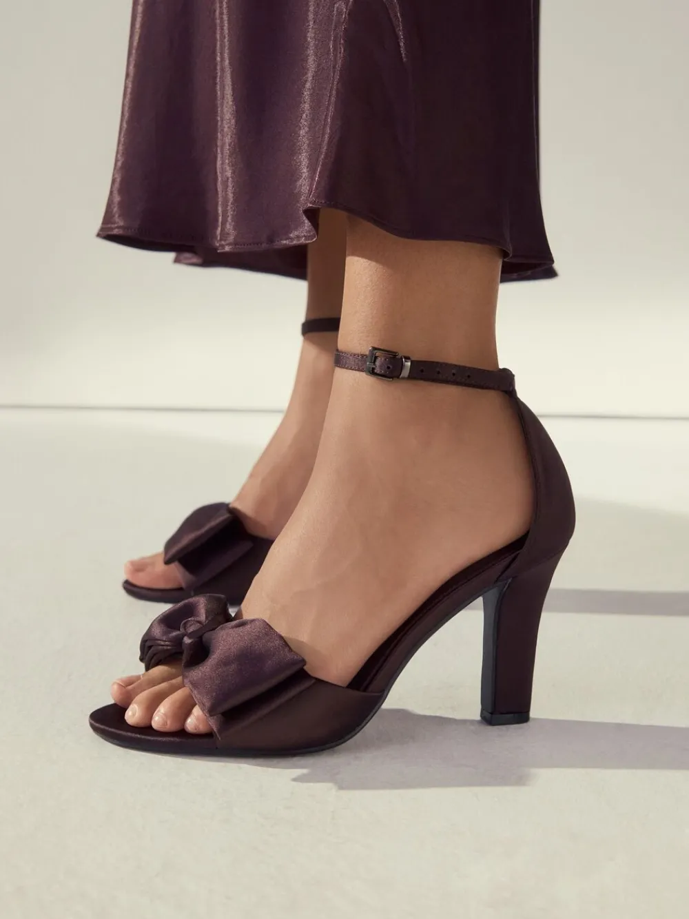 Step out in style with these elegant heeled sandals in chocolate brown. The satin upper offers a luxe feel, while the bow detailing and block heel create a sophisticated look. With Forever Comfort® padding and an adjustable ankle strap, you’ll be comfortable all night. Satin upper Forever Comfort® padding Bow detailing Adjustable ankle strap Block heel Hakhoogte 10 cm. Bovenwerk – textiel; voering en voetbed – overige materialen, zool – Andere materialen.