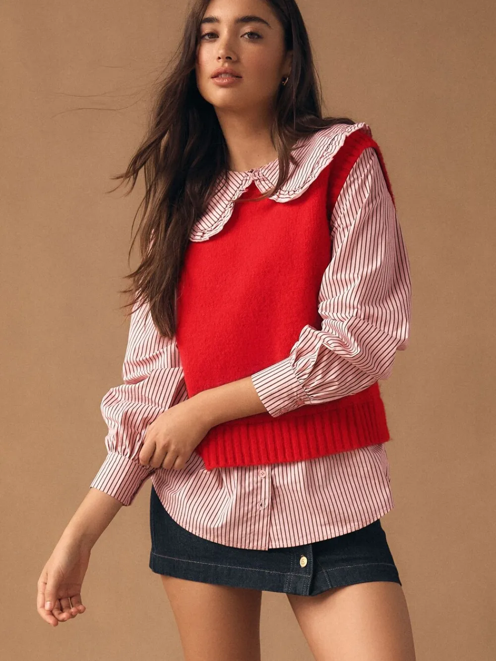 Infuse your daily ensemble with a touch of modern charm with this vibrant red knitted tank. Expertly crafted with a blend containing wool, this eye-catching piece features a layered pinstripe shirt underneath, complete with a statement frill collar and long sleeves. The layered design offers a polished and sophisticated look that transitions effortlessly from day to night, ensuring you stay both warm and stylish. Frill collar shirt layer knitted tank Long sleeve Contains wool Collar Machinewasbaar. Knit 52% Recycled polyester, 37% Acrylic, 8% Wool, 3% Elastane. Woven 100% Cotton.