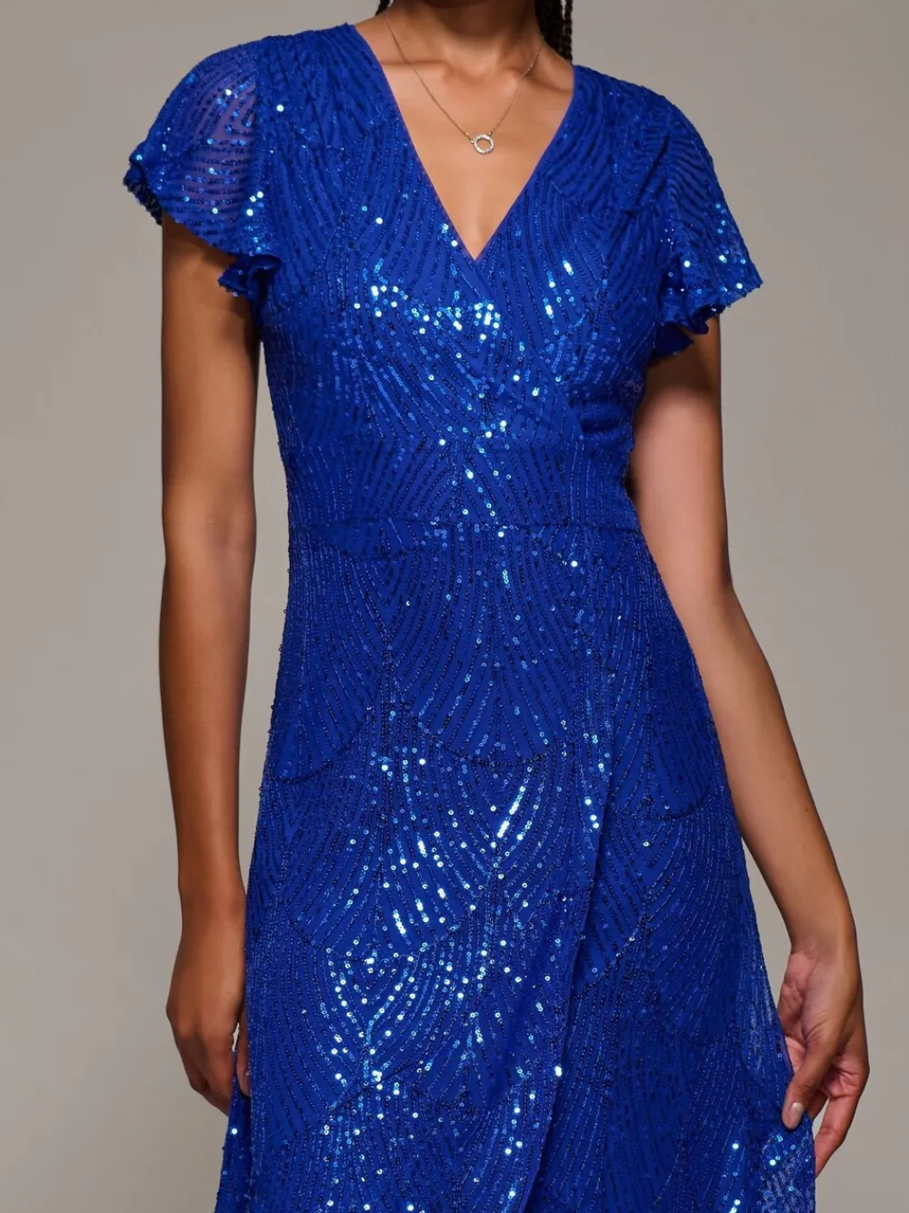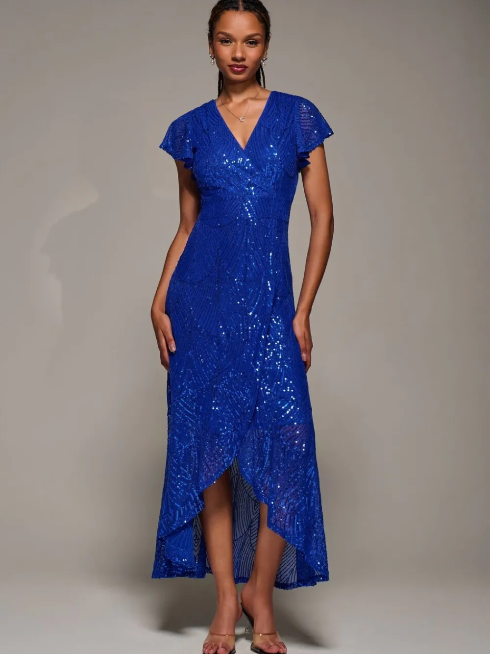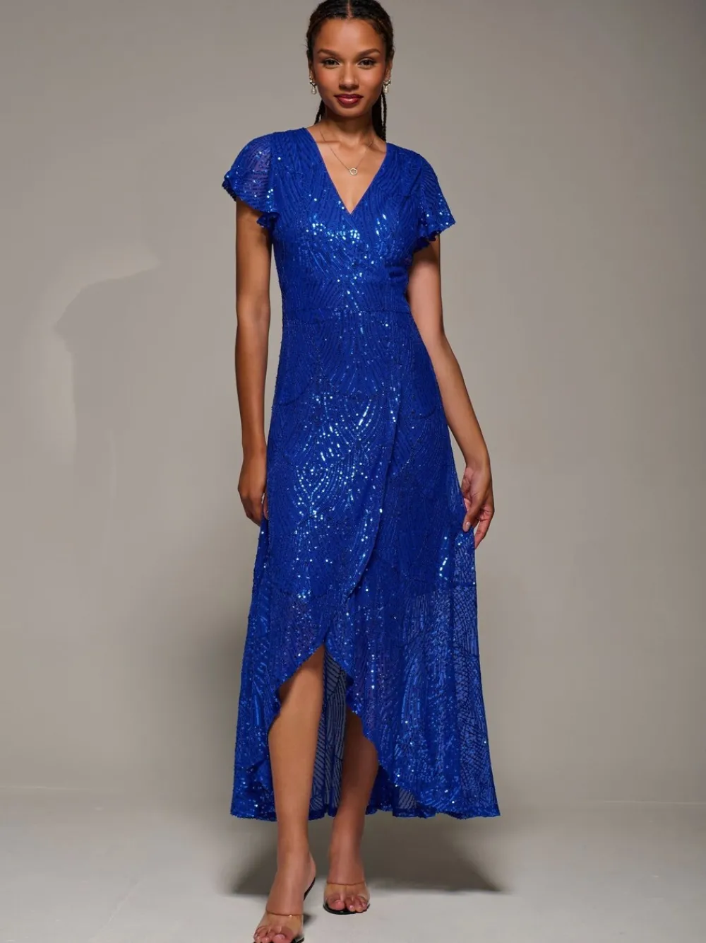 Frill Short Sleeve Sequin Maxi Dress by Jolie Moi features a wrap-style bodice with a V-Neckline and short frill sleeves, paired with a matching wrap skirt that falls into an elegant asymmetric hem. The fitted waistband flatters the figure, while a concealed back zip offers a smooth finish. A cascading frill from waist to hem adds graceful movement to complete the look. Model is 170cm and wears a size 8. Length: 138cm. Machinewasbaar. 100% polyester.