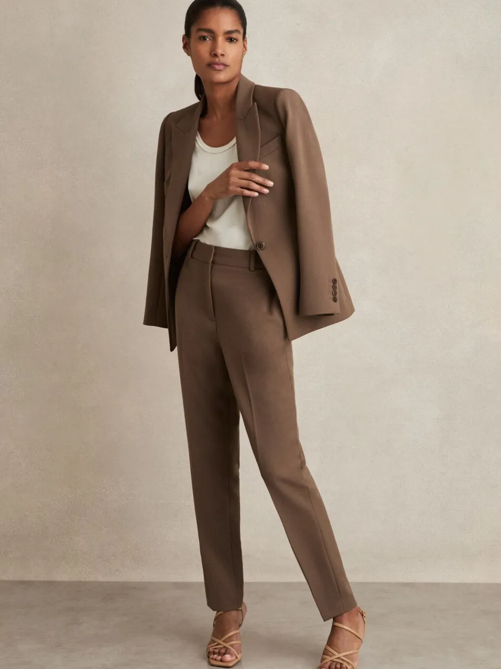 Crafted Mink Neutral from a smooth-feel, comfort-stretch fabric, the Mink Neutral Gabi suit blazer has a single-breasted, tailored shape, perfect for pairing with the matching trousers. Matching trousers Single breasted Vent to reverse Lined Tailored fit The model is wearing a size 26. Measurements of model: Height 5ft 10” / 177.8cm. Alleen chemisch reinigen. Bovenkant 67% polyester, 28% viscose, 5% elastaan. Afwerking 100% Polyester.