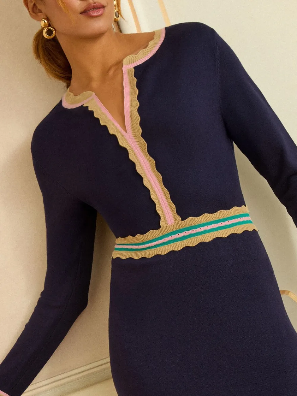 Embrace sophisticated knitwear with this purple long-sleeve midi dress. Featuring a flattering notch neck and striking multi-coloured chevron patterns at the waist and hem, this dress is stylish and cosy. Perfect for adding a vibrant, fashionable touch to your cold-weather wardrobe. Chevron pattern detailing Notch neck Long sleeves Knitted midi dress 69% viscose, 31% nylon.