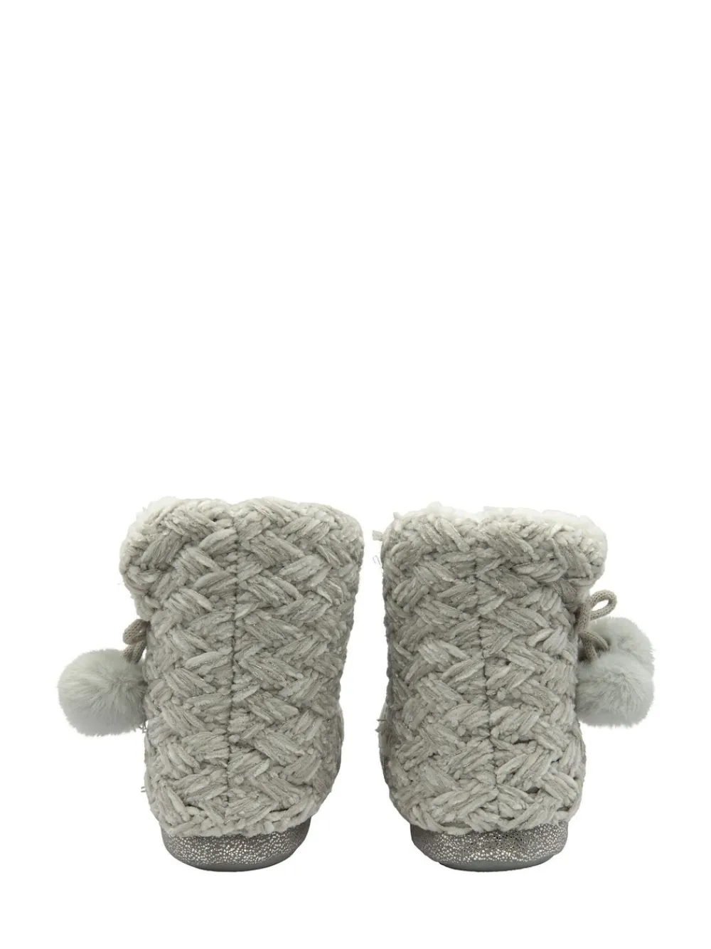 Comfortabele gebreide pantoffels voor dames met zachte bontkraag, pompons en een traagschuim sok. Hoofdbestanddeel – 100% textiel. Voering – 100% textiel. Zool – 100% andere vezels.