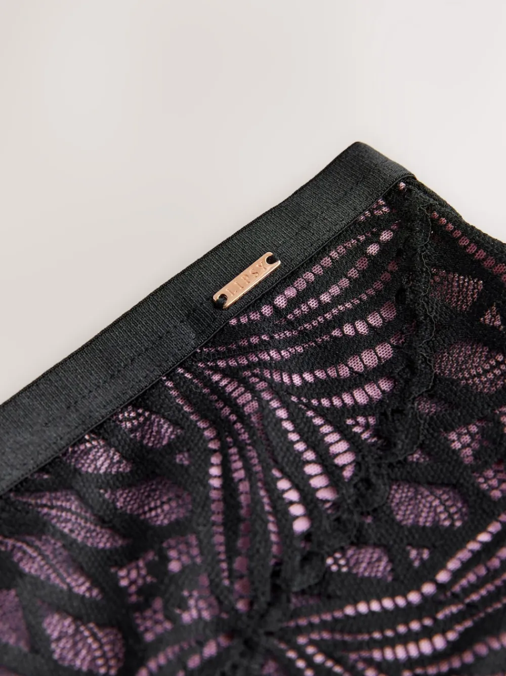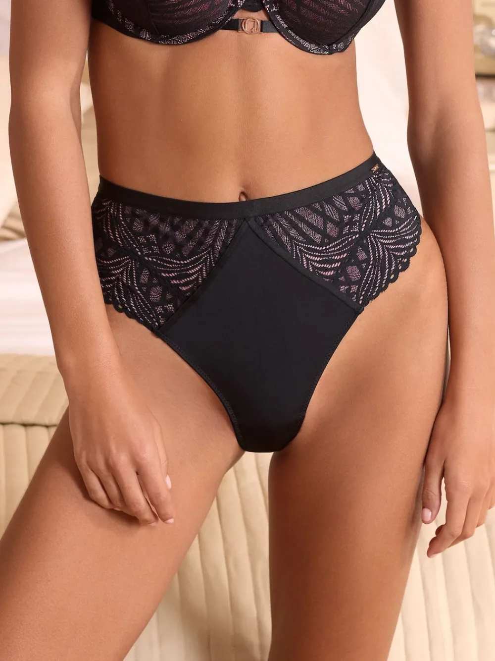 Define your silhouette with this striking high-rise knicker. Featuring a trendy high-leg cut and a flattering wide waistband, it showcases gorgeous black geo lace over a pink contrast base. Perfect for a luxurious lingerie look, its sophisticated design is finished with subtle branded hardware. High-rise, high-leg fit Geo lace detailing Branded hardware Coordinates with matching pieces Machinewasbaar. Buitenkant 87% nylon, 13% elastaan. Inzetstuk 100% katoen.