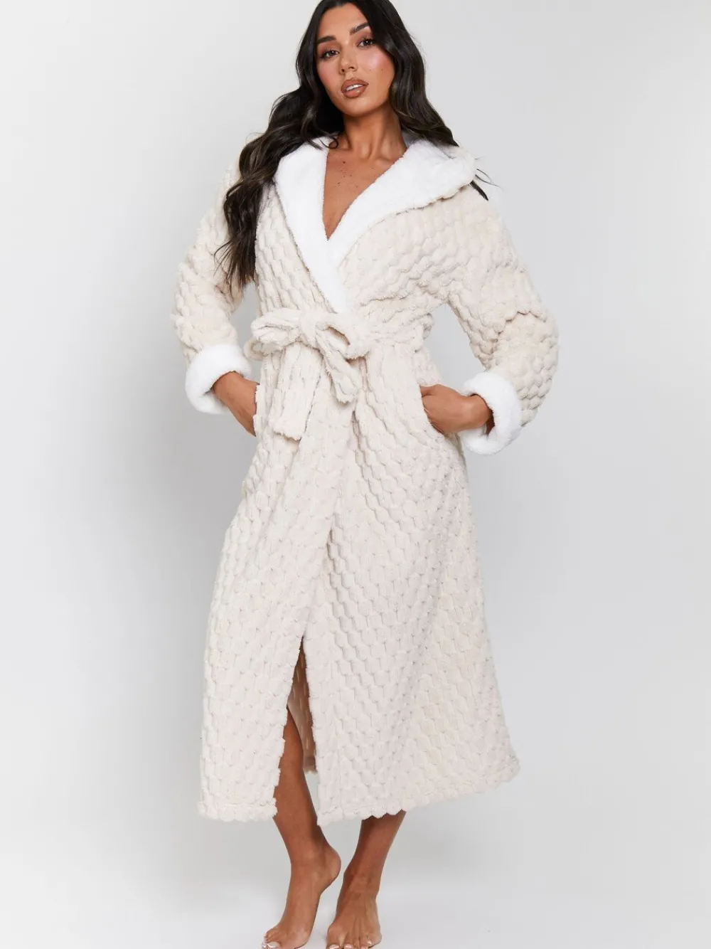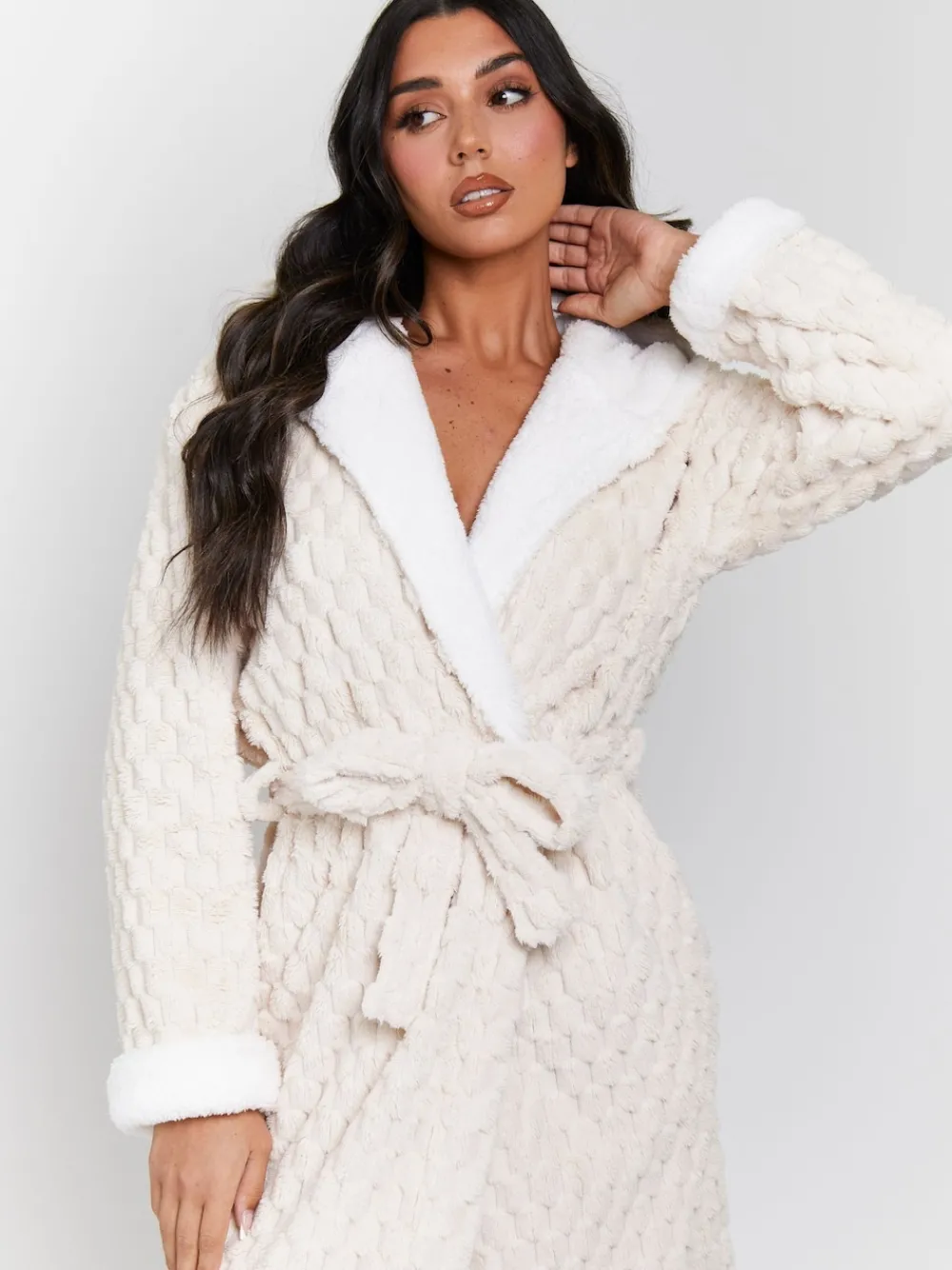 Our classic gown with added texture. Fleece-lined hood Geometric textured detail Fluffy collar and cuffs Model is 5ft 8” and wears size S. Machinewasbaar. 100% polyester. Waarschuwing: weg houden bij vuur en vlammen.