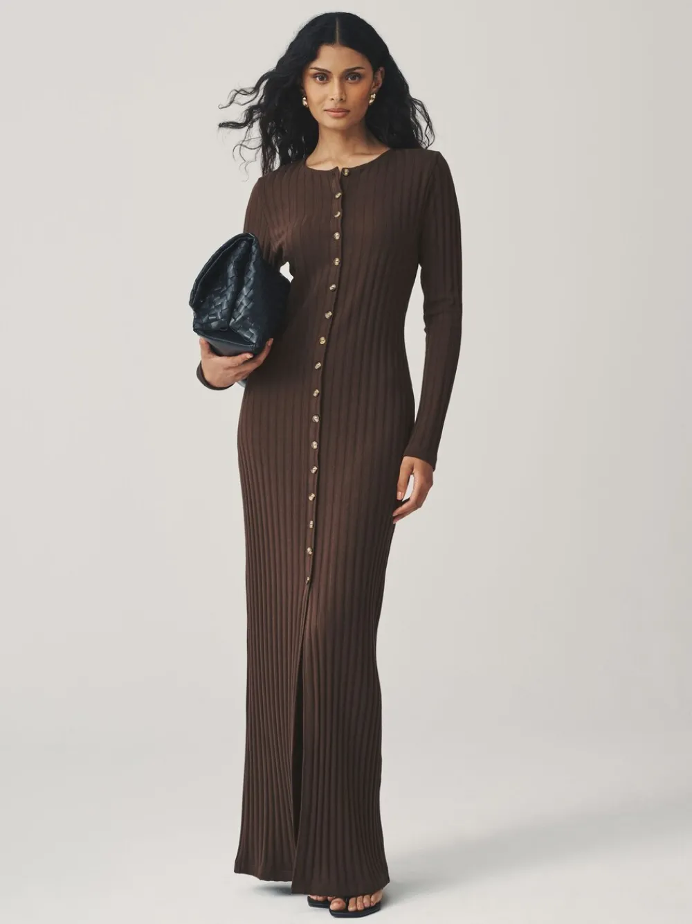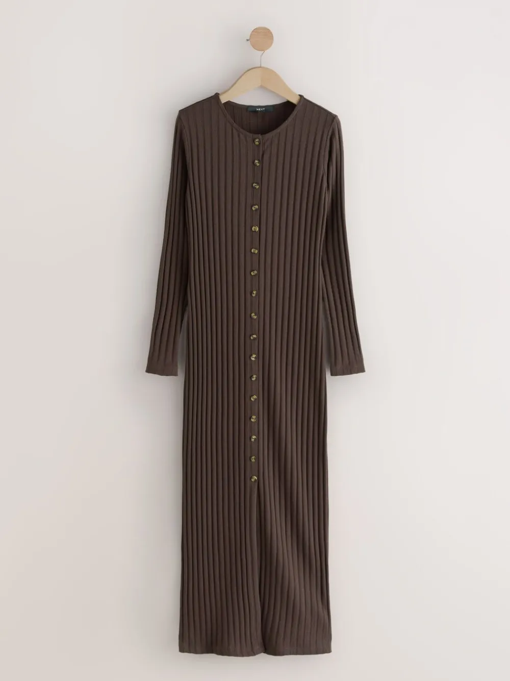 – Geribbelde midi-jurk met knoopsluiting en lange mouwen*Next Online