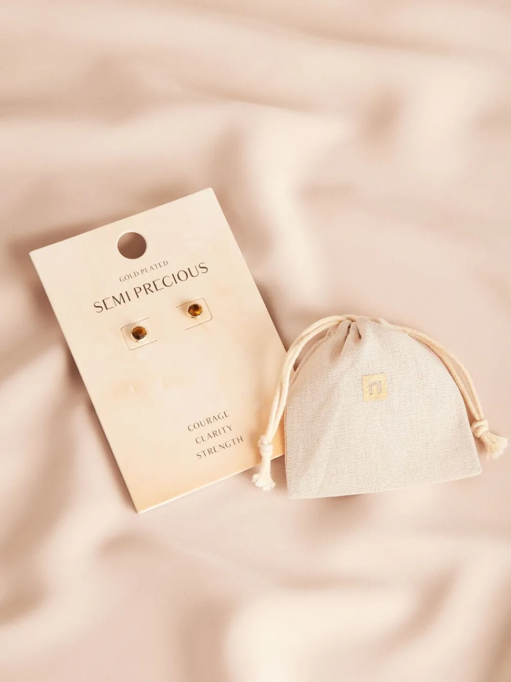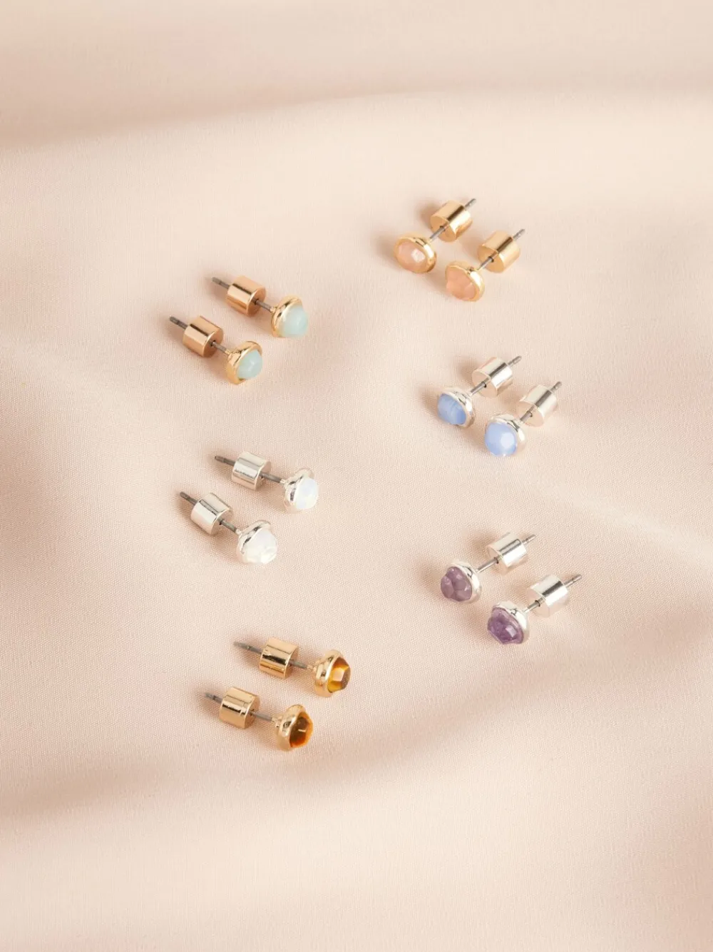 This stud earring is made using semi-precious stones, with real gold or silver plating. It comes beautifully packaged on a card that describes the traditional properties of that stone and a keepsake pouch. Rose Quartz – Liefde, optimisme, medeleven Amazoniet – Harmonie, Integriteit, Communicatie Tijgeroog – Moed, helderheid, kracht Opaal – Optimisme, Geluk, Waardering Amethist – Helderheid, Wijsheid, Creativiteit 70% gerecycled zink, 27% kiezelkleurig, 3% staal.