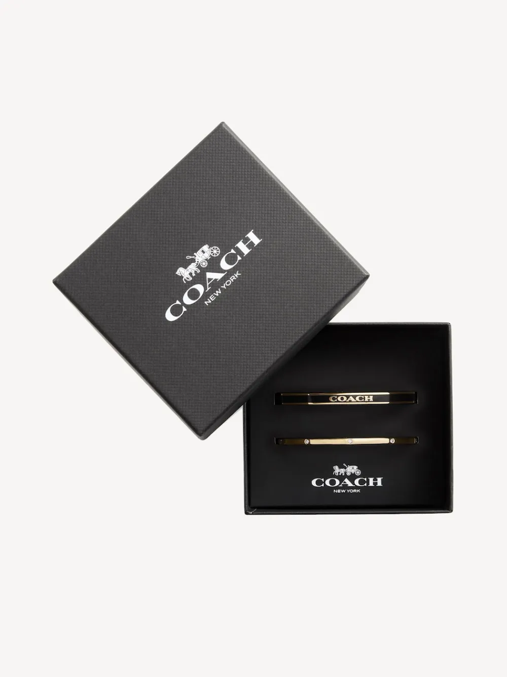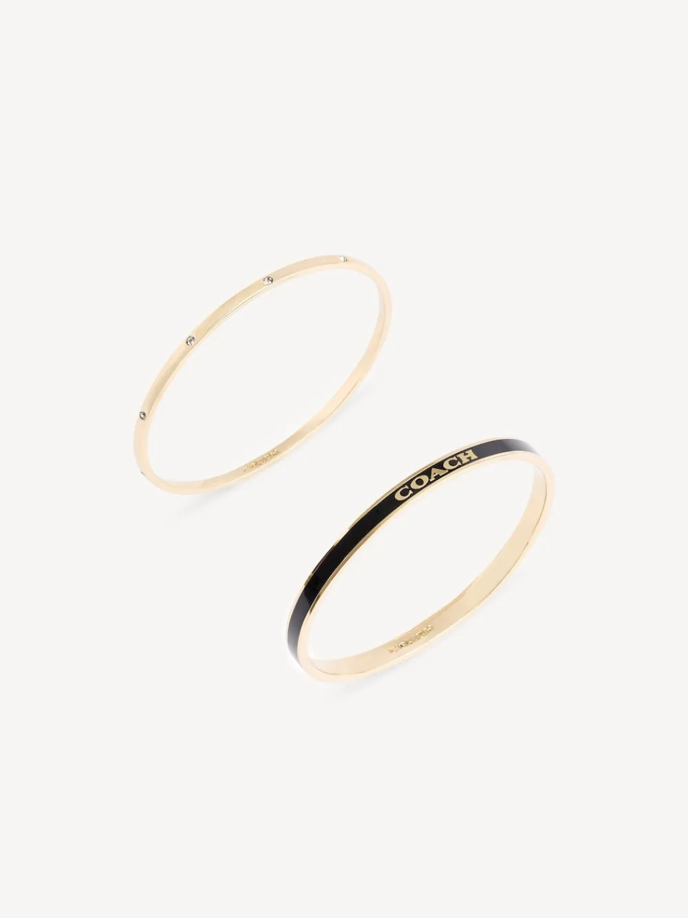 Duo Gold/Black bangle bracelet set featuring an everyday black bangle with signature logo and coordinating metal bangle adorned with minimal crystal stones. Set includes 2 separate bangles to mix and match. Bracelets can be slipped on easily. Made from brass, enamel, and glass crystal. Comes packaged in a signature COACH gift box. 69% Brass, 21% Stone, 10% Glass.