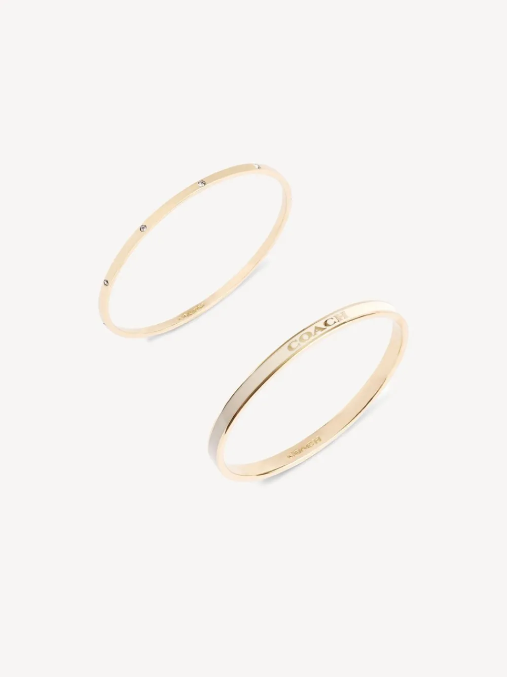 Duo bangle bracelet set featuring an everyday chalk bangle with signature logo and coordinating metal bangle adorned with minimal crystal stones. Set includes 2 separate bangles to mix and match. Bracelets can be slipped on easily. made from brass, enamel, and glass crystals. Comes packaged in a signature COACH gift box. 69% Brass, 21% Stone, 10% Glass.