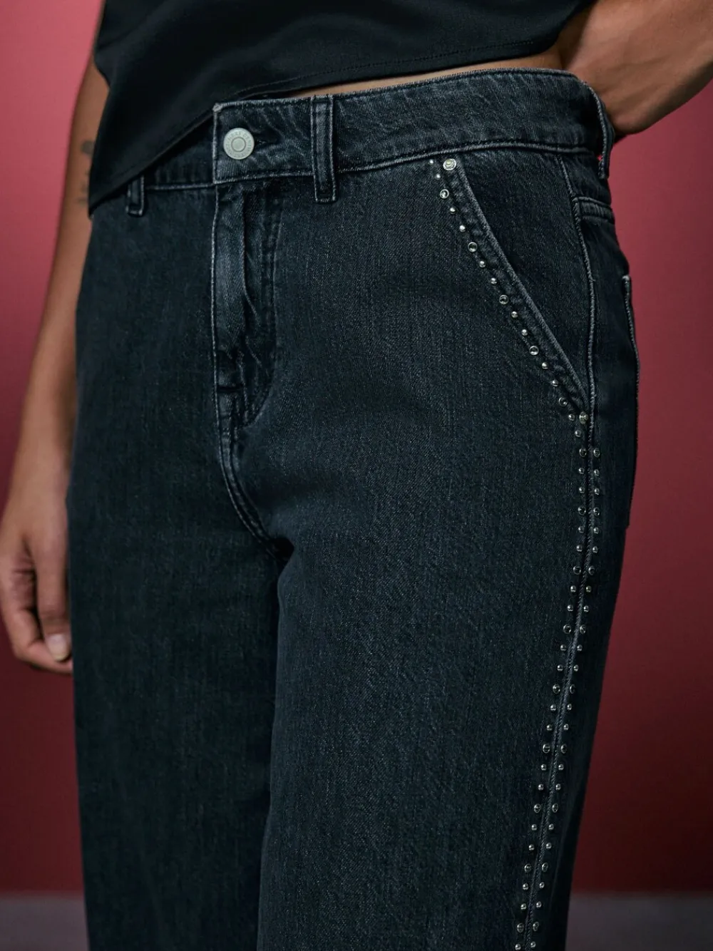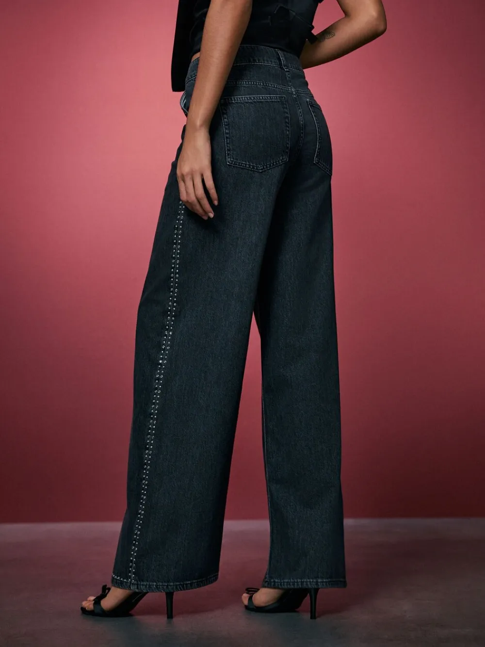 These wide leg palazzo studded jeans are perfect for the upcoming party season, with a flattering high waistline and button fly fastening. Our 100% cotton rigid denim has no stretch and will naturally be a little snug at first, but it will ease with wear allowing for the perfect fit. We suggest buying your usual size, or if you are inbetween sizes you should size up. Short voor binnenbeenlengte 27″ / 69cm. Regular voor binnenbeenlengte 29″ / 74cm. Lang genoeg voor binnenbeenlengte 31″ / 79cm. Machinewasbaar. 100% katoen. Artikelen met het curve-logo zijn verkrijgbaar in de maten 18 en groter.