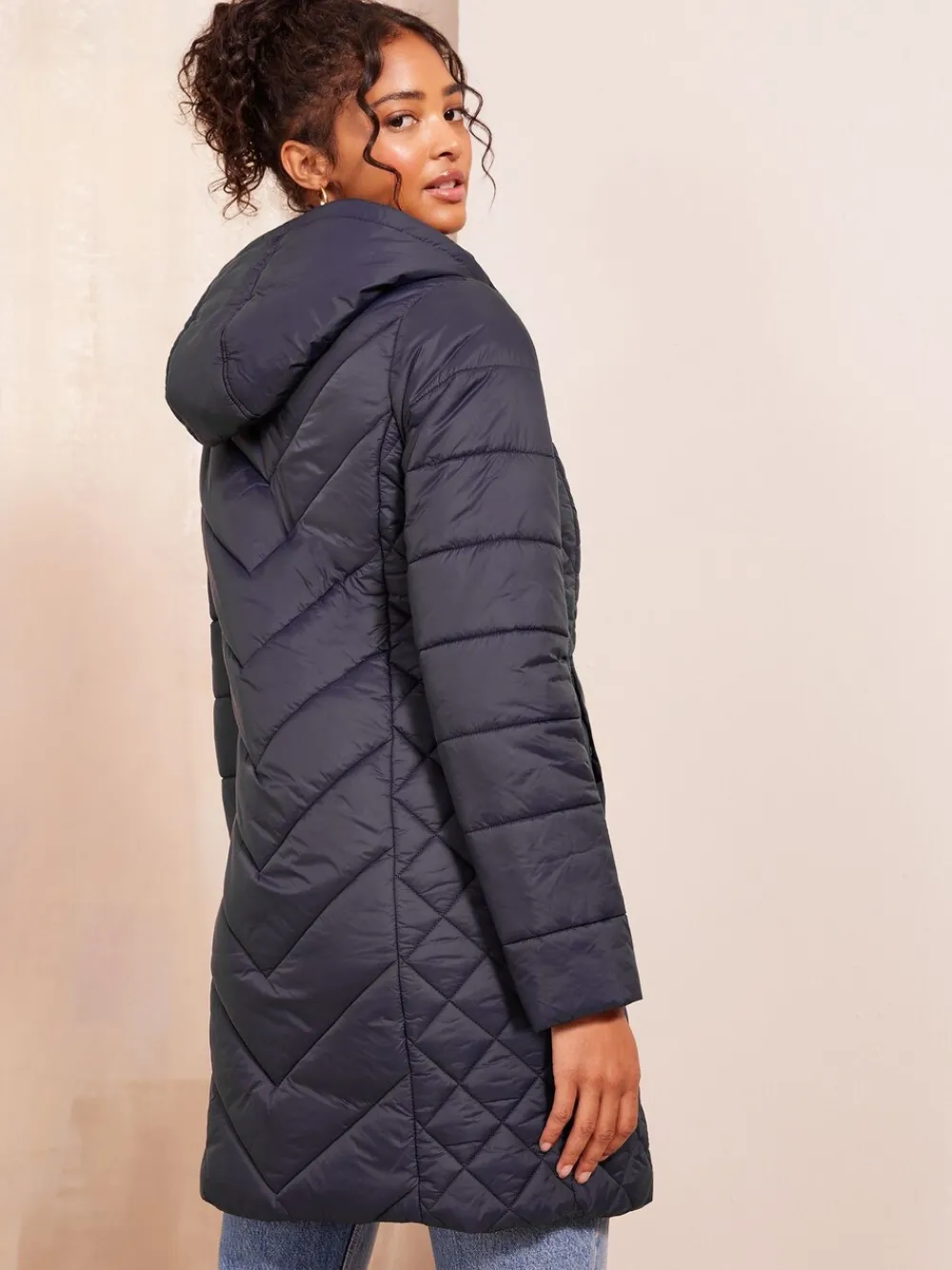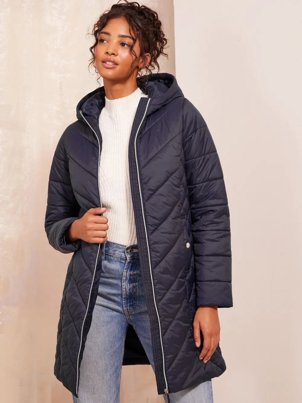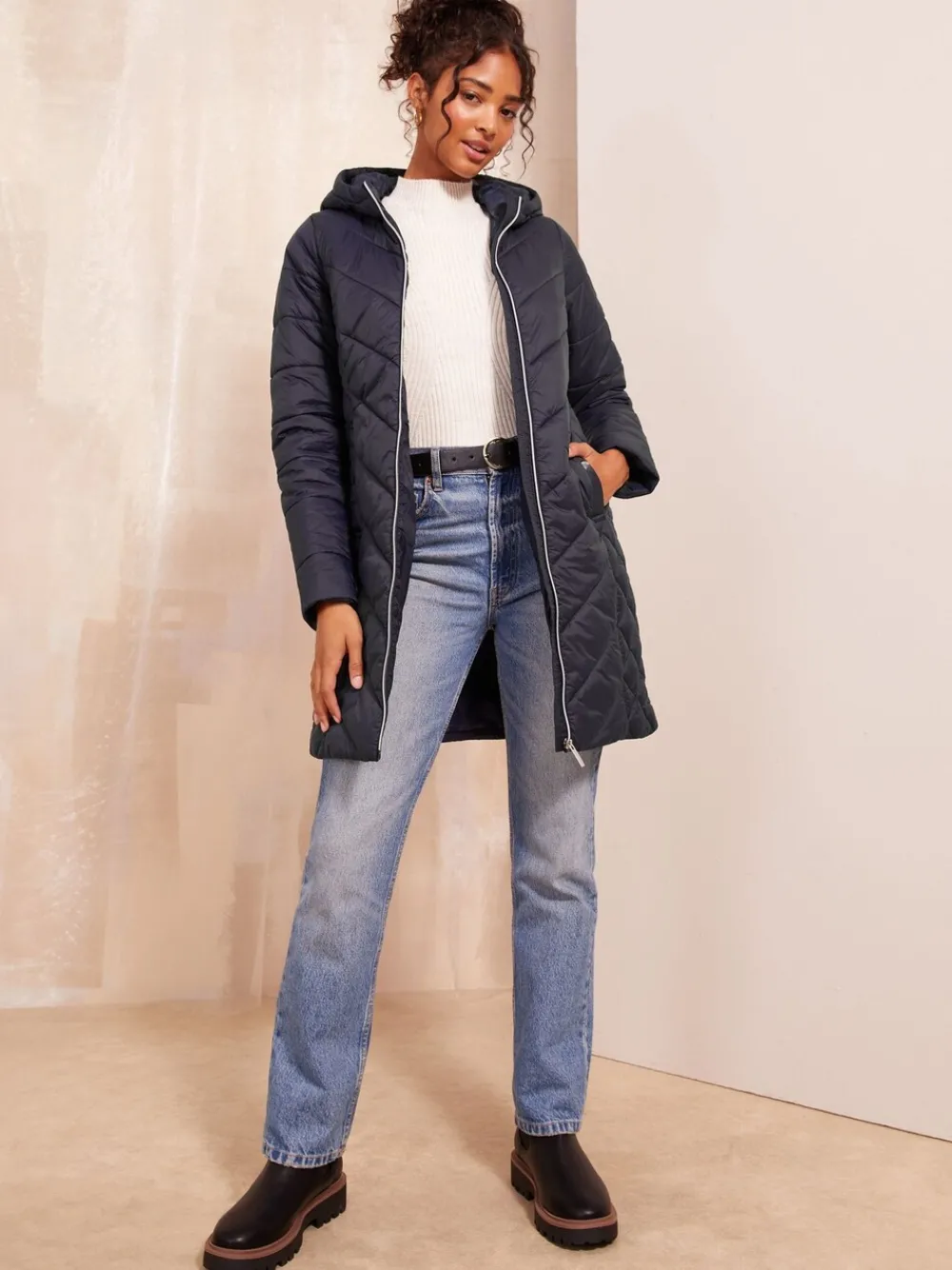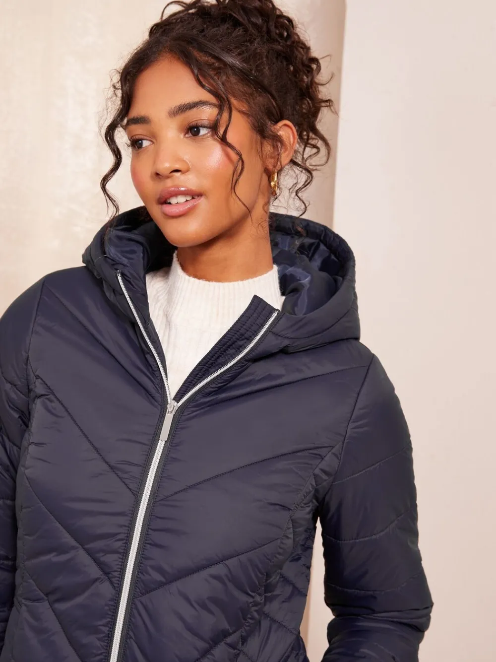 Deze middellange doorgestikt jack is het perfecte herfst-winteritem. Kenmerken: Voorzien van een capuchon Lange mouwen Praktische zakken Ritssluiting Het model draagt maat 8 en is 5m 9. Draaglengte (van zijkant nek tot zoom) – 88 cm. Materiaal 100% nylon. Voering 100% polyester. Vulling 100% polyester.